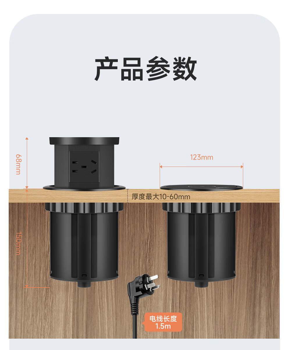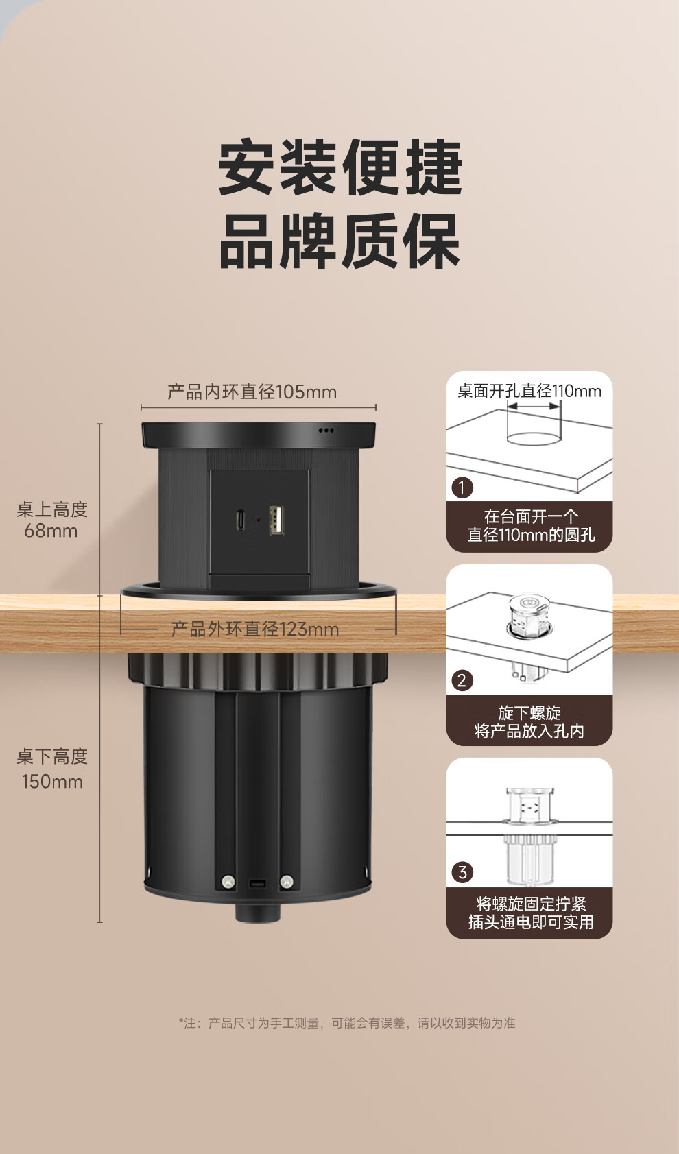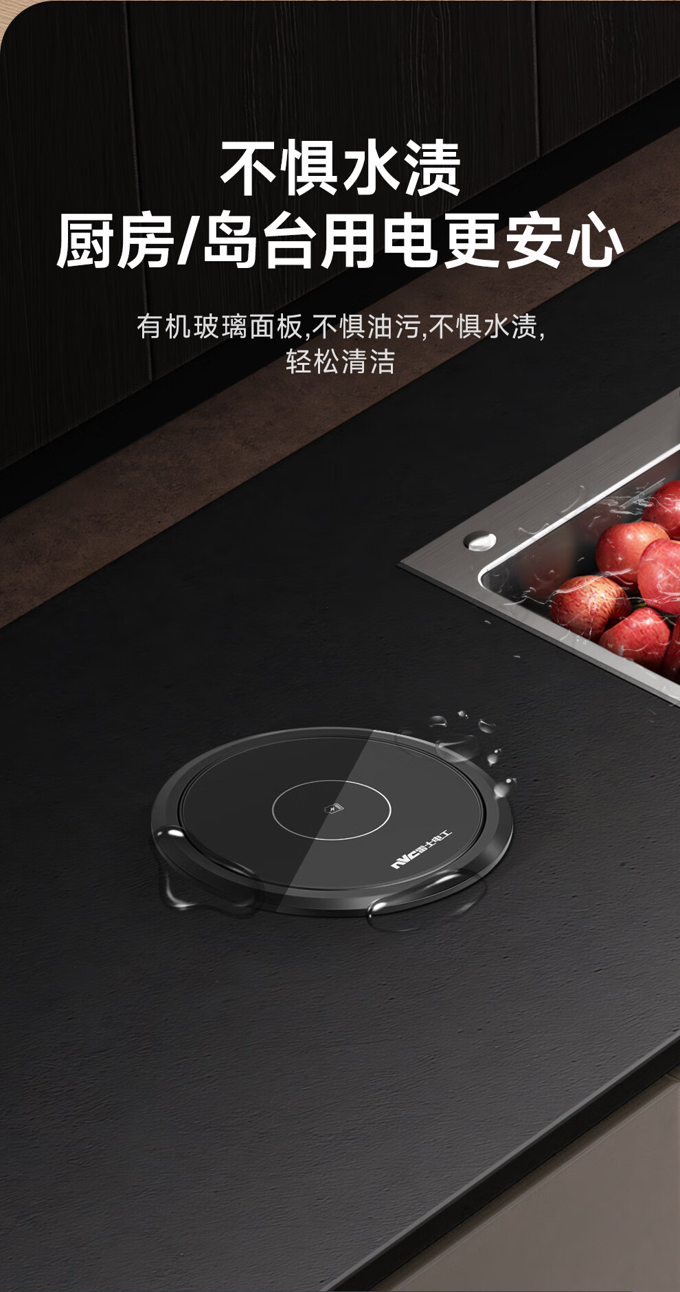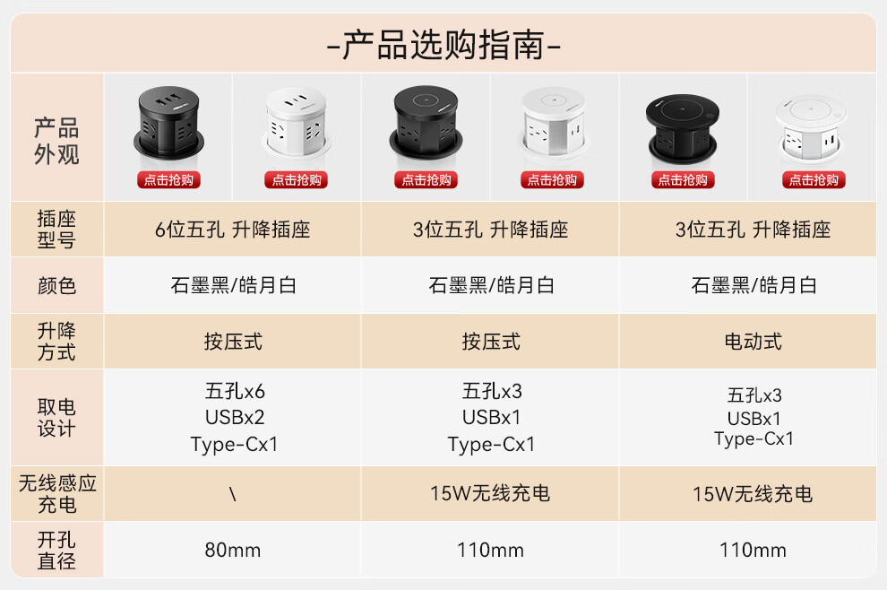 NVC雷士电工 升降插座 气动嵌入式无线充电插座 三位五孔带USB+TypeC 黑色
