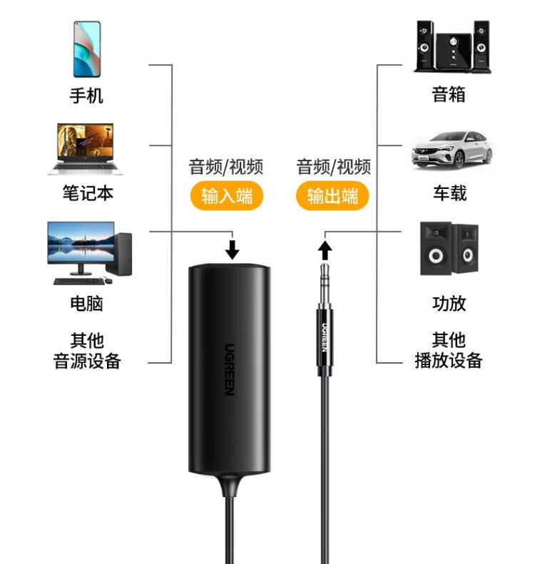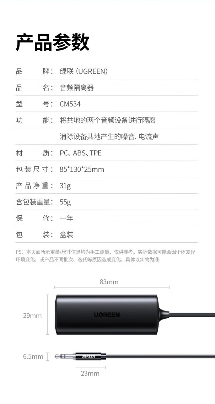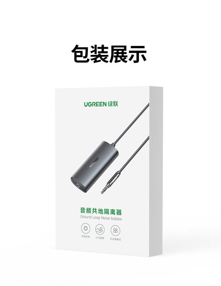 绿联3.5MM音频隔离器  音频降噪滤波器共地干扰隔离器适用AUX音频车载音响箱功放过滤杂音电流声90491
