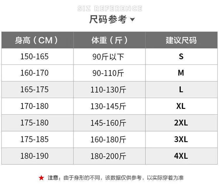 China (cm) 165 / 88-90 170 / 96-98 175 / 108-110 180 / 118-122 185 / 126-130