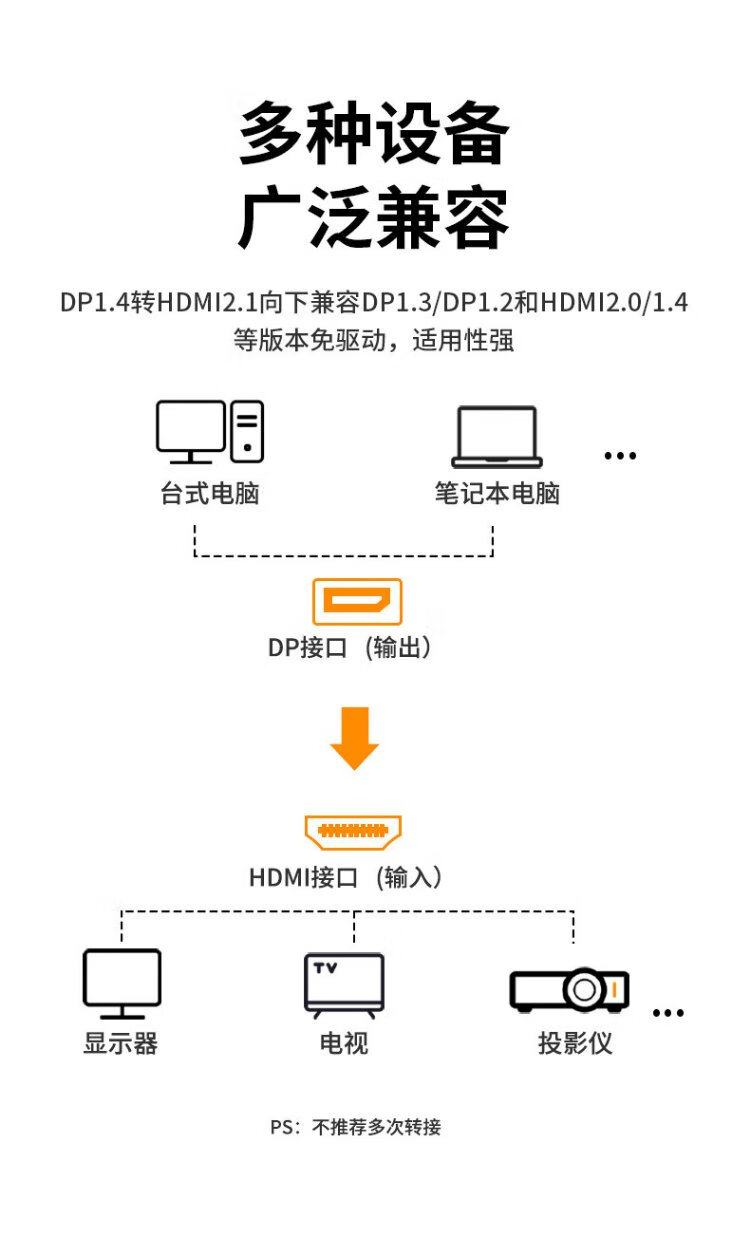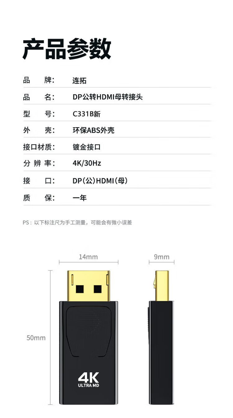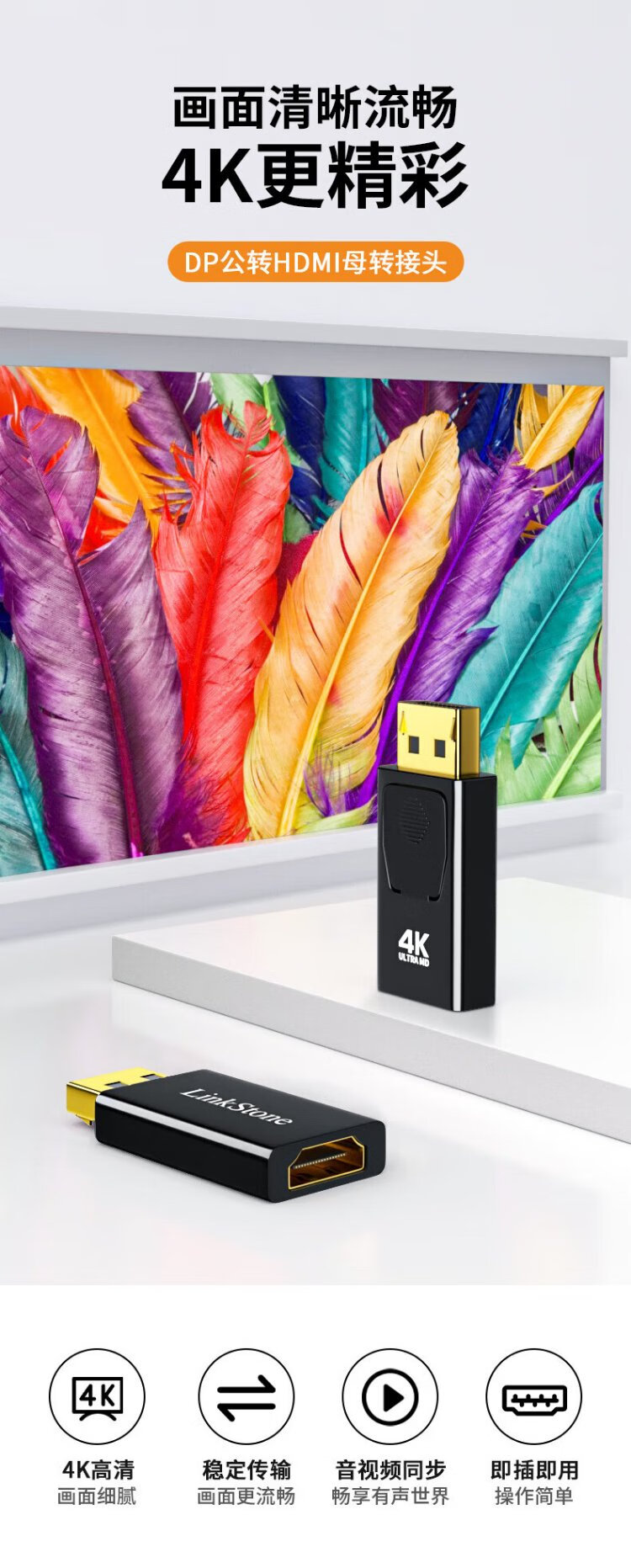 连拓 DP转HDMI转接头 4K高清公对母接口displayport电脑笔记本电视显示器投影仪视频连接线转换器
