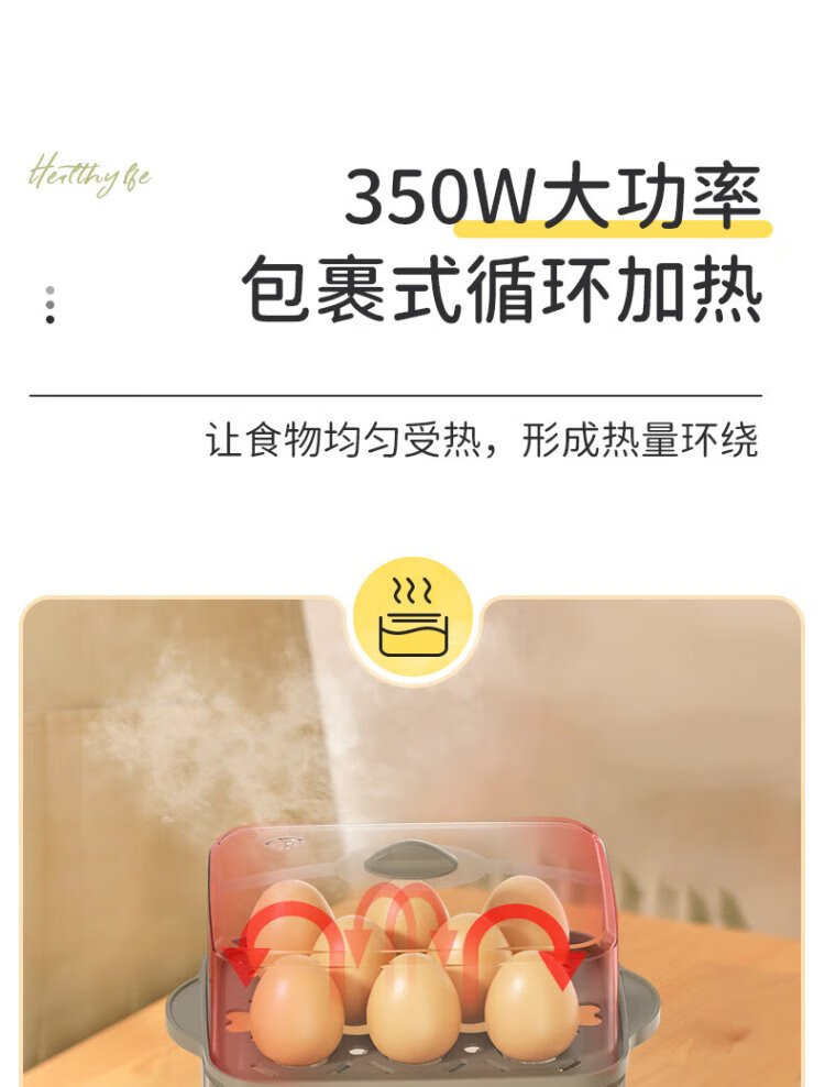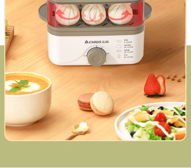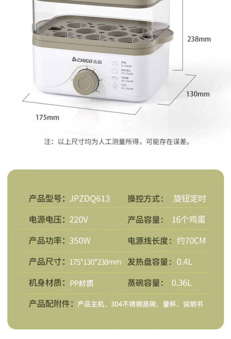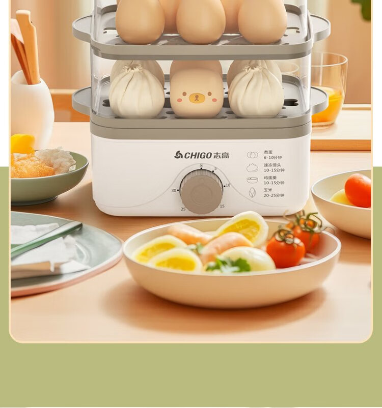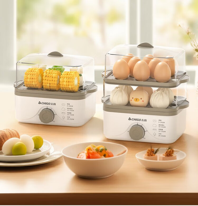 CHIGO Eierkocher, Eierdampfer, Eierkocher kleiner Dampfgarer, Knopf-Timer, automatische Abschaltung, doppelschichtiger elektrischer Dampfgarer, Frühstückseierkocher, Dampfschüssel + Messbecher JPZDQ613