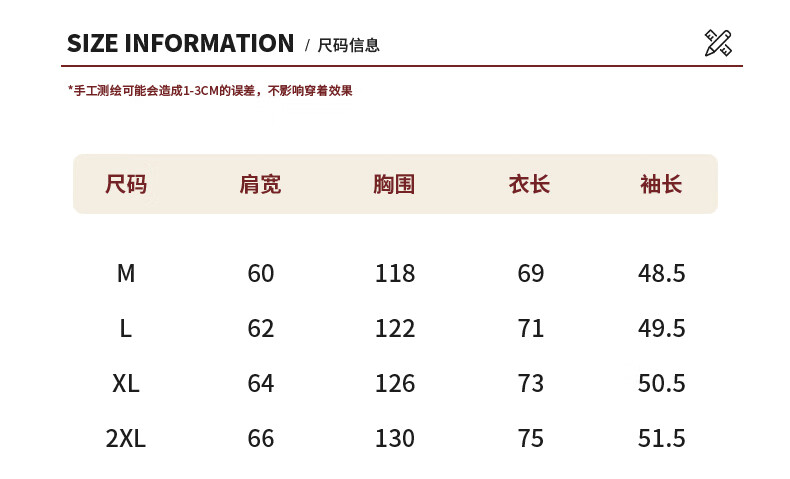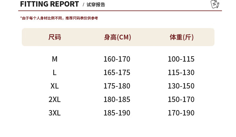 China (cm) 165 / 88-90 170 / 96-98 175 / 108-110 180 / 118-122 185 / 126-130