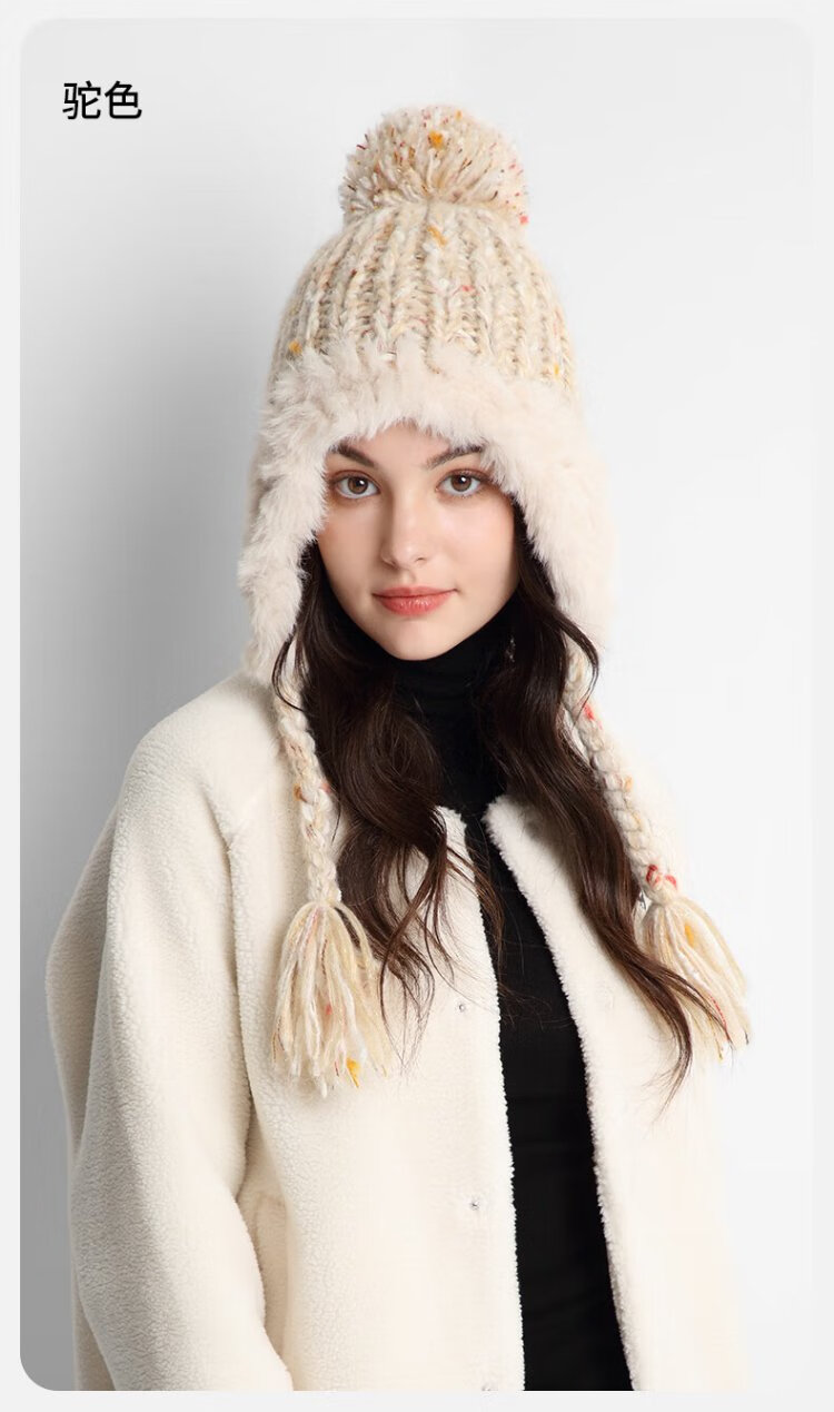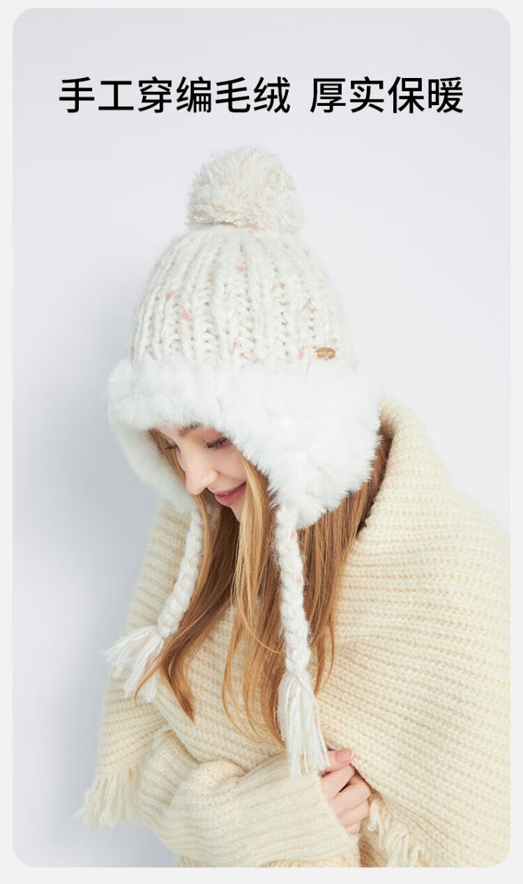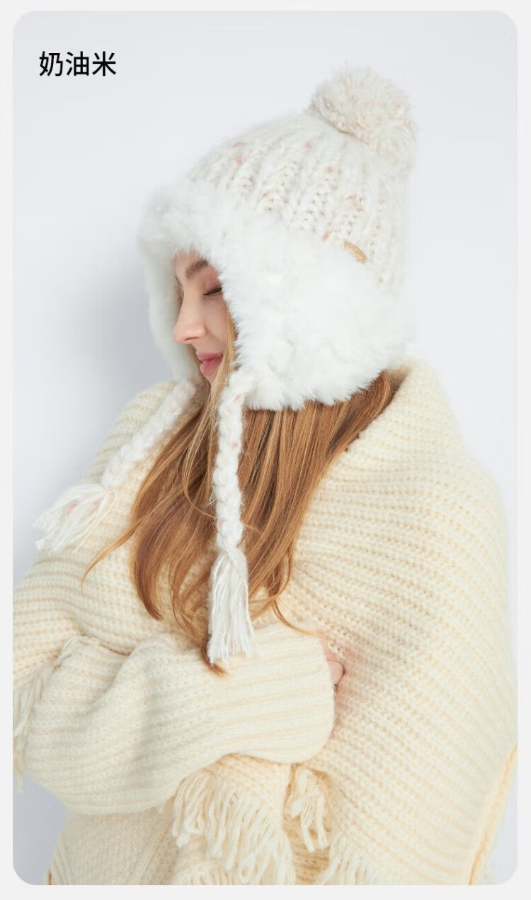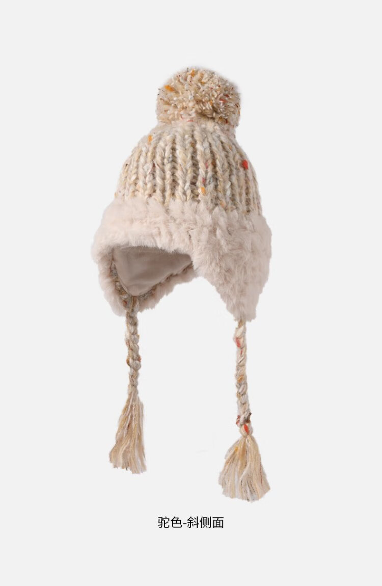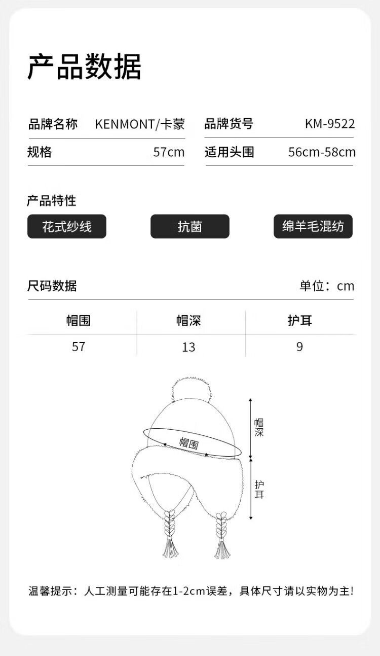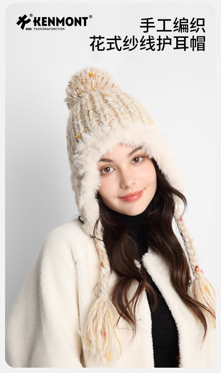 卡蒙(Kenmont)手工编织流苏羊毛毛线帽女冬加绒加厚护耳保暖毛绒针织帽km-9522