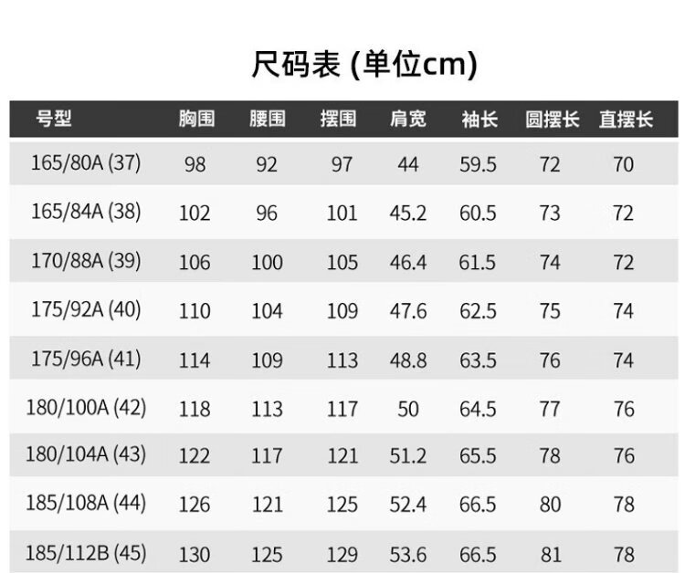 China (cm) 160-165/84-86 165-170 / 88-90 167-172 / 92-96 168-173 / 98-102 170-176 / 106-110