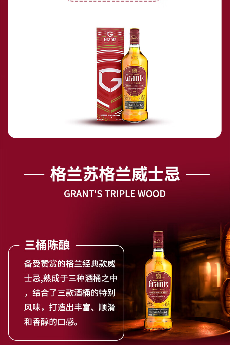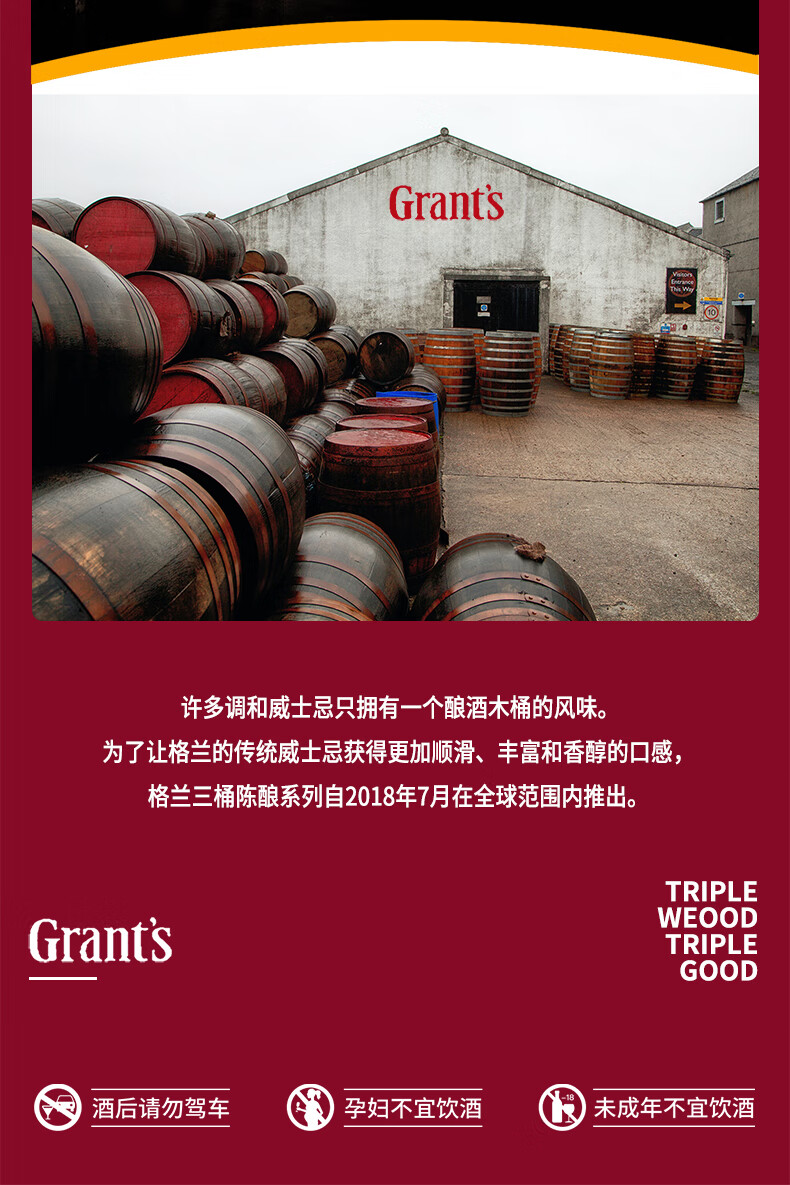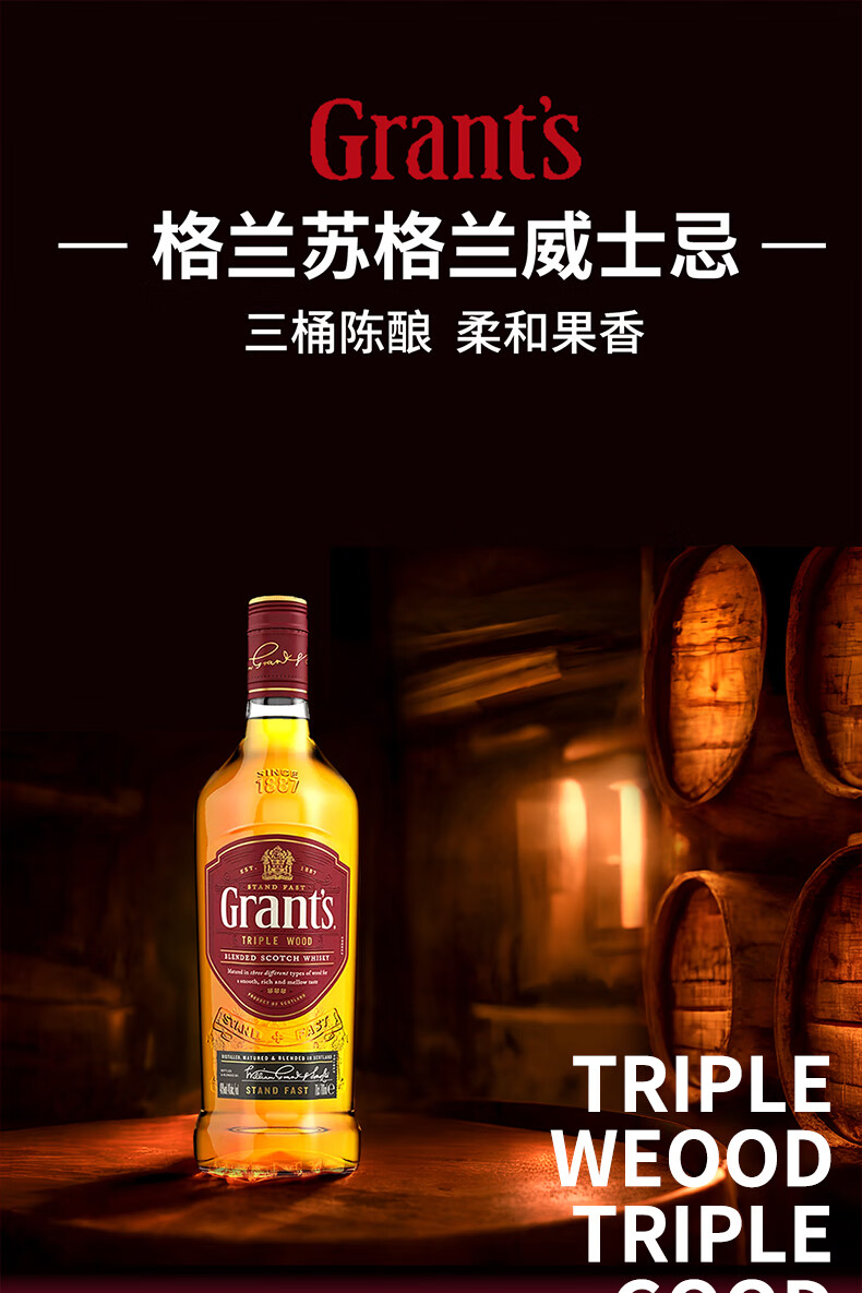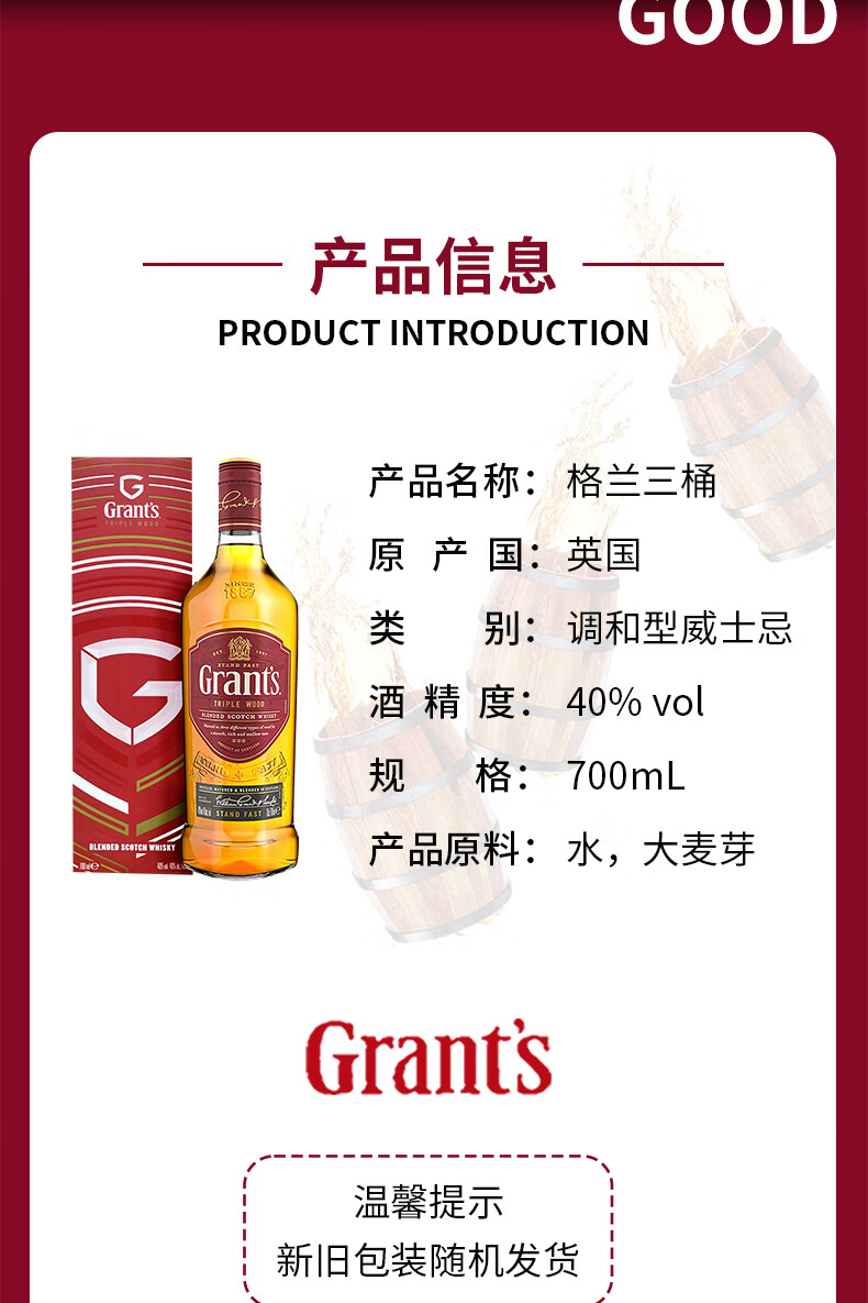 格兰(Grant's)三桶 苏格兰调和威士忌 700ml 40度 礼盒装 进口洋酒