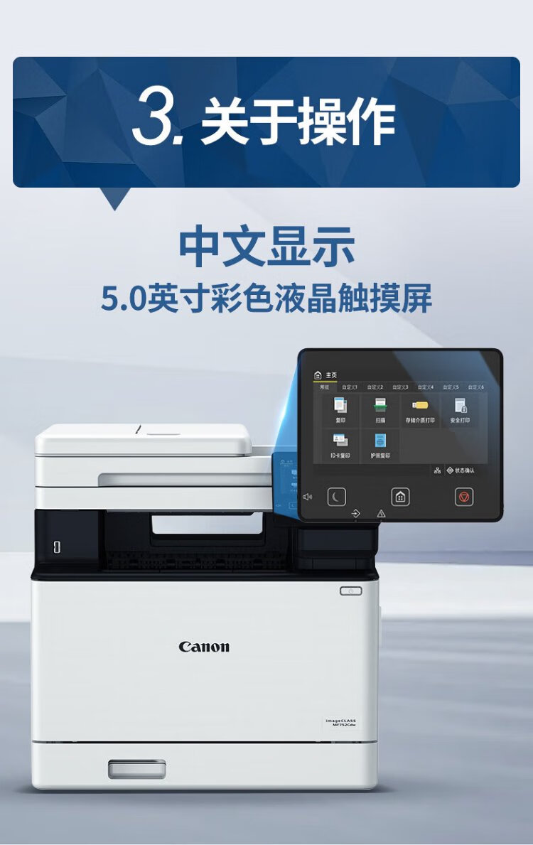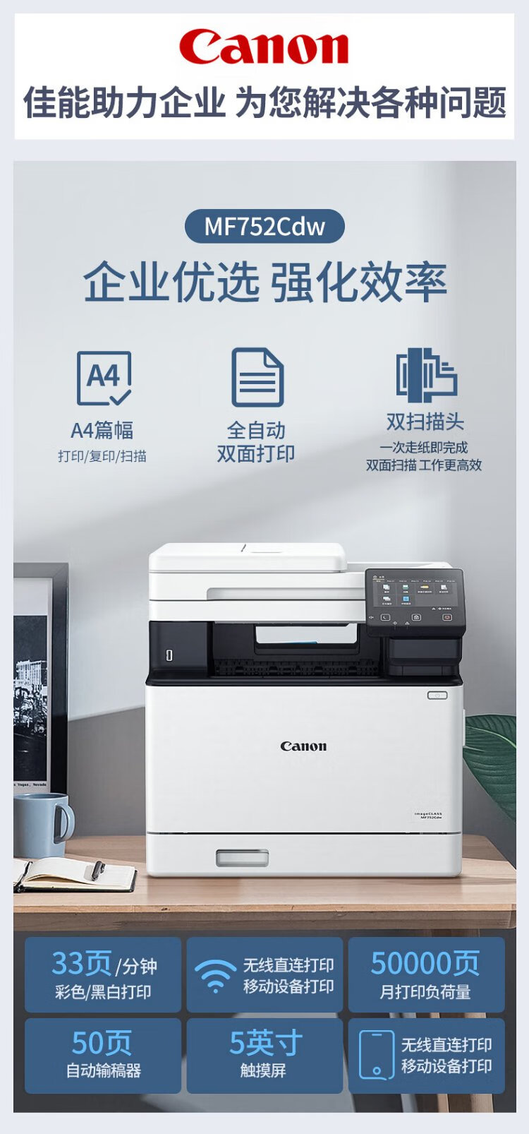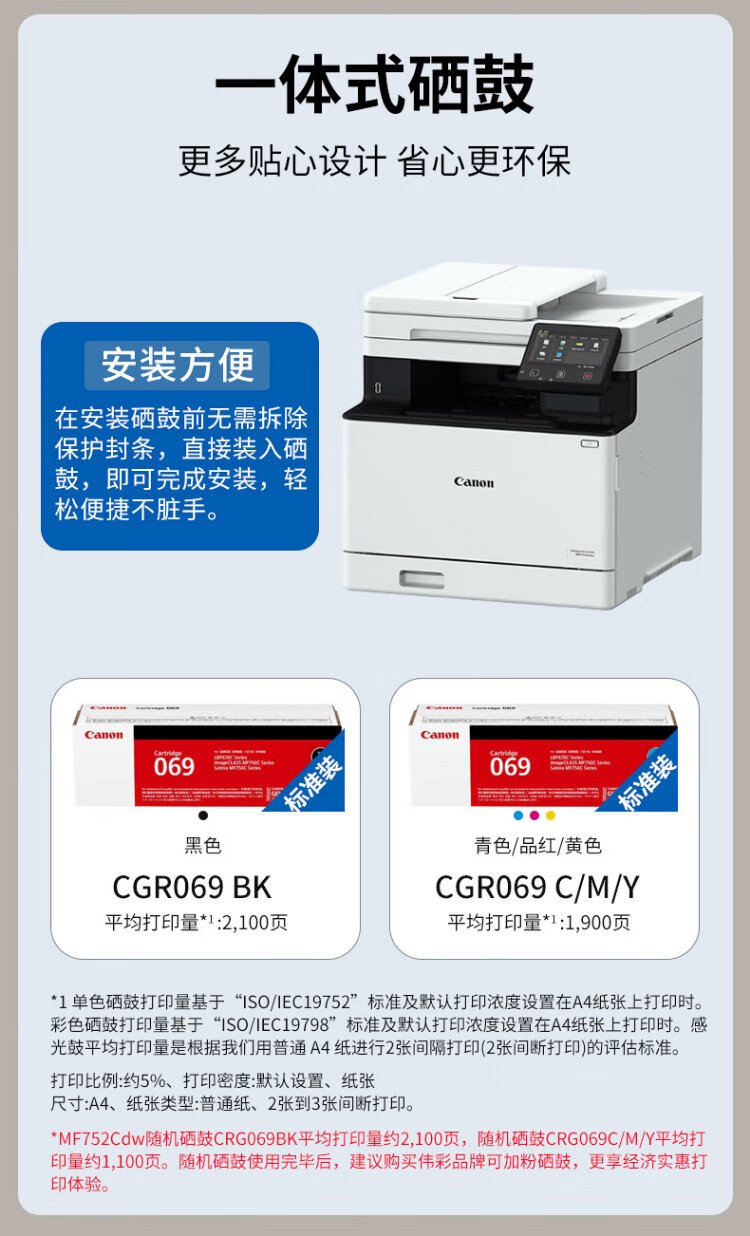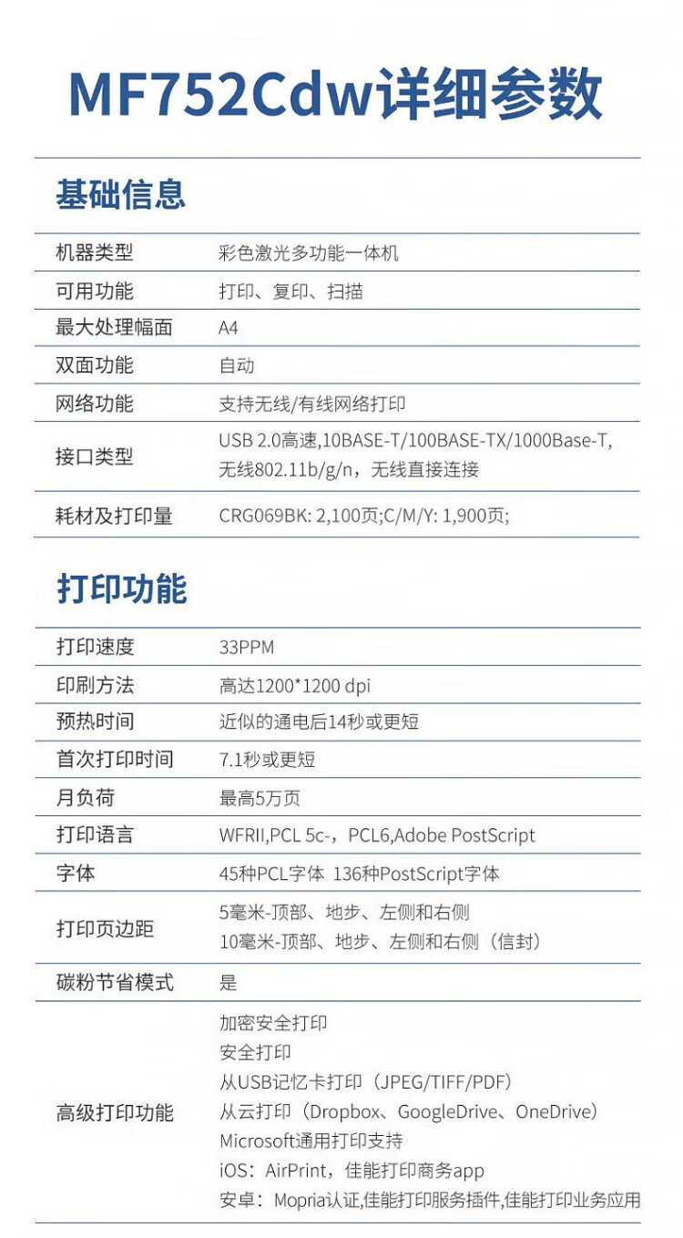 佳能(Canon) MF752Cdw A4幅面彩色激光打印机多功能一体机 办公商用自动双面打印 打印复印扫描无线三合一