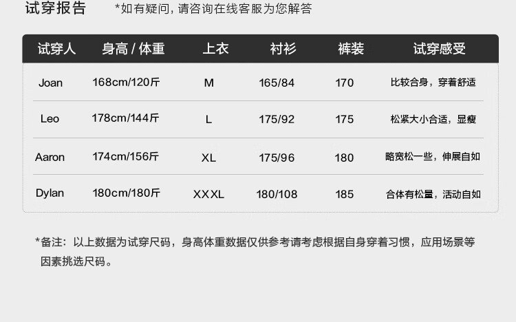 China (cm) 165 / 88-90 170 / 96-98 175 / 108-110 180 / 118-122 185 / 126-130