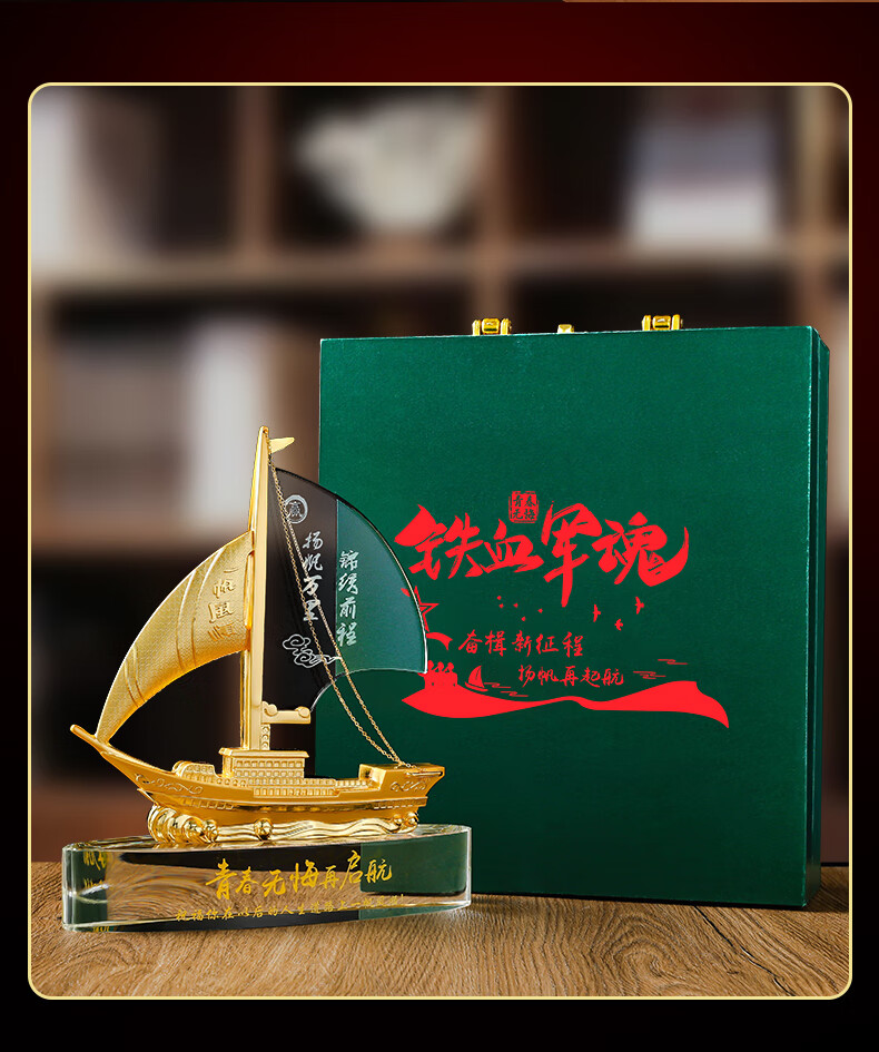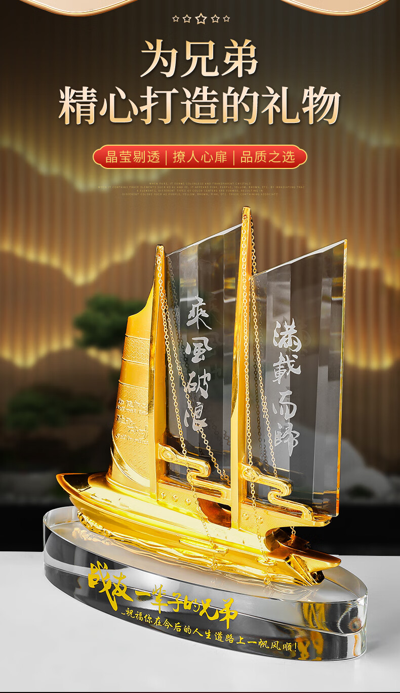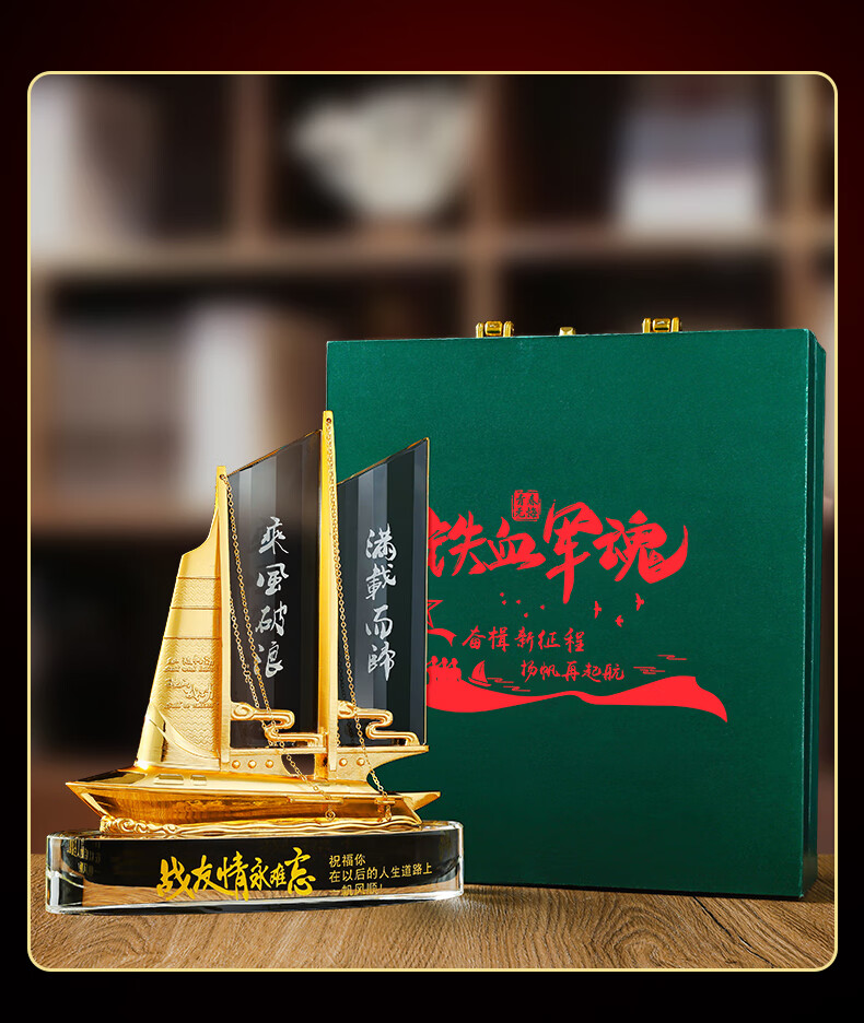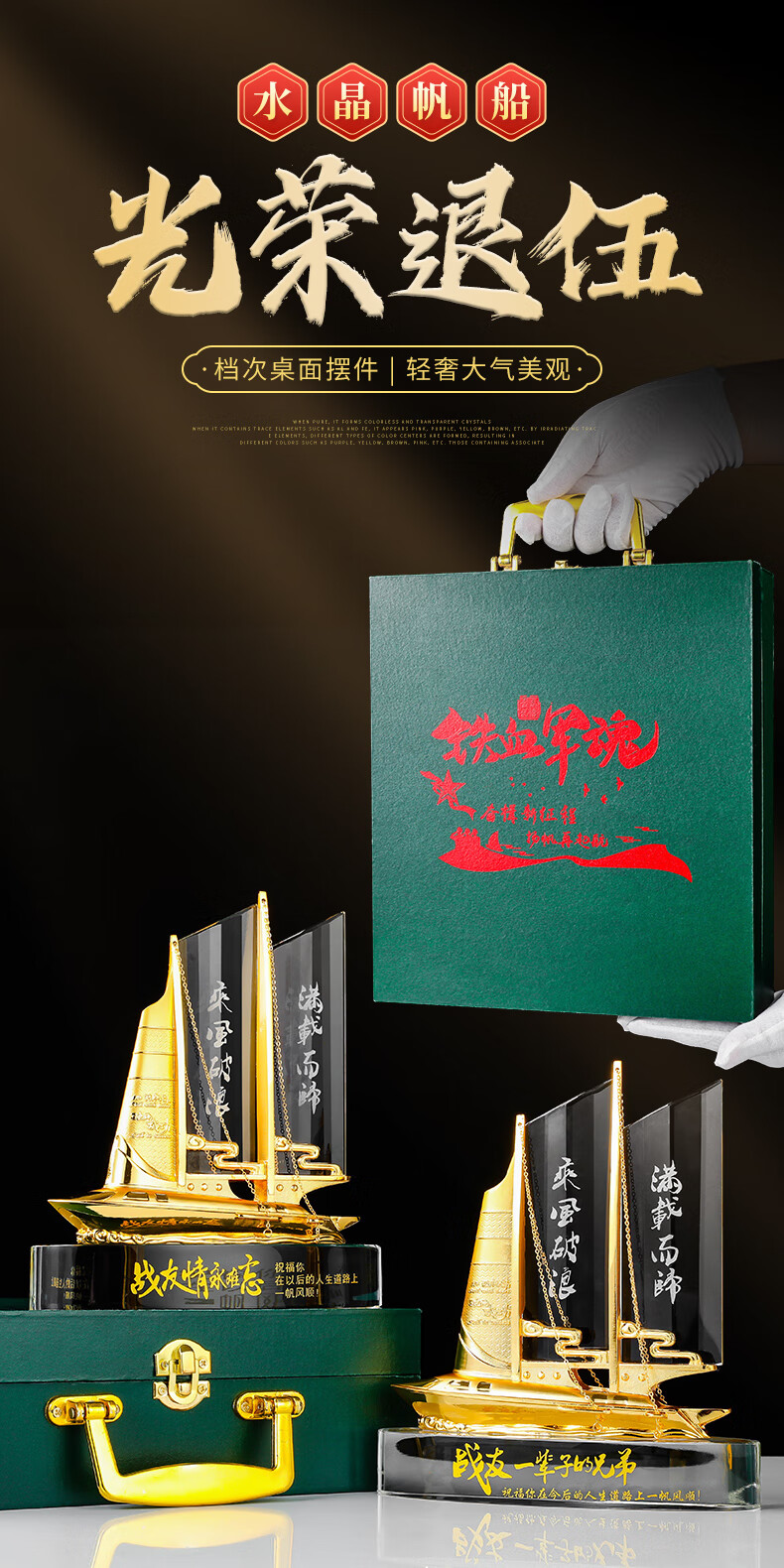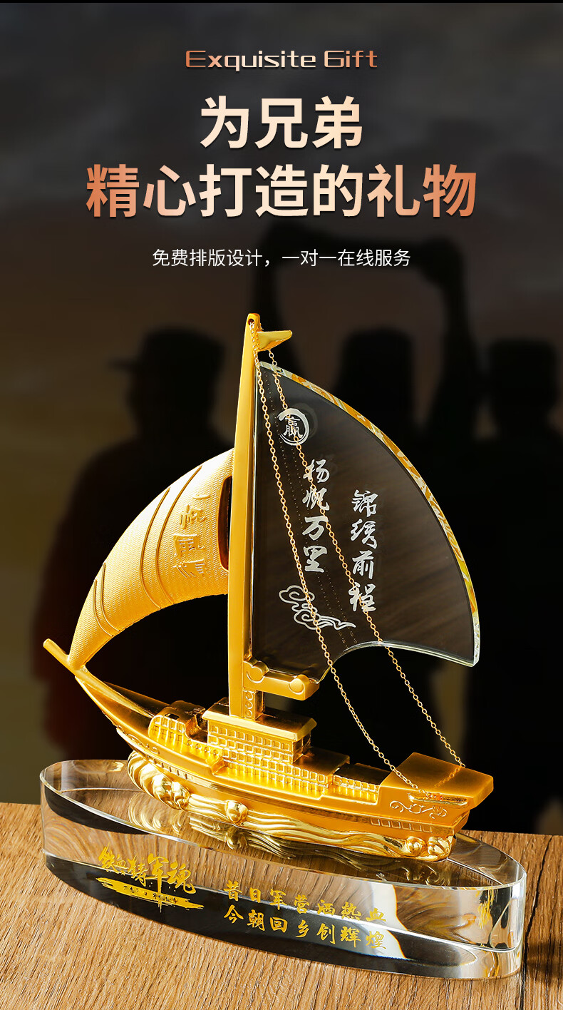 晨旭 退伍纪念品定制刻字水晶帆船摆件创意礼品送战友礼物男生兄弟退休离职老兵退役军人聚会留念