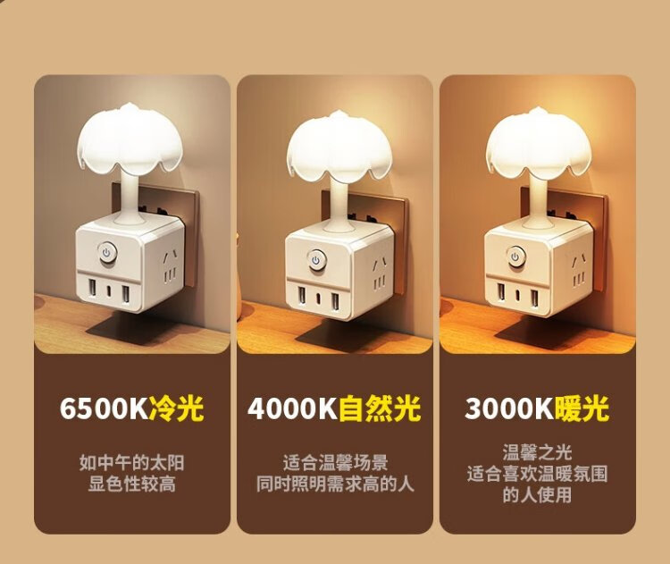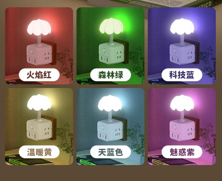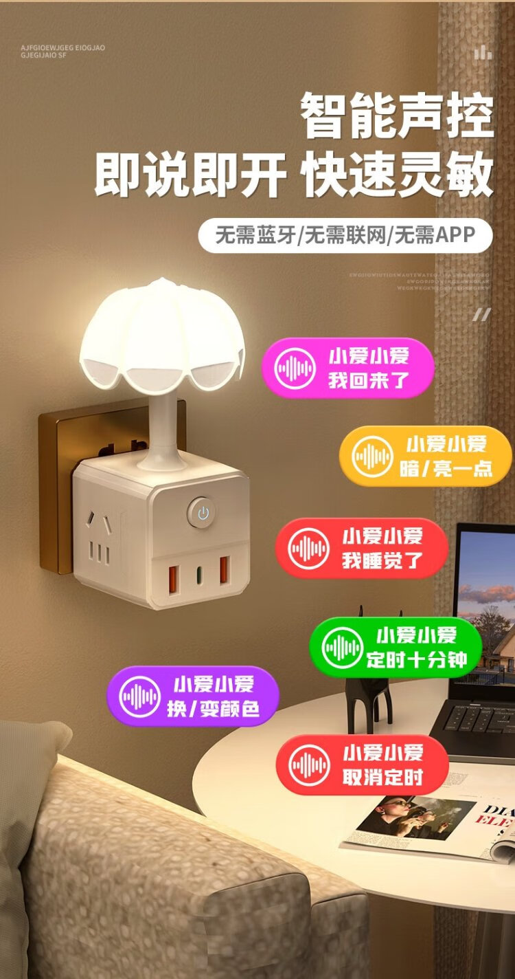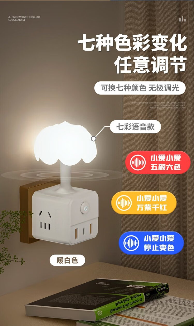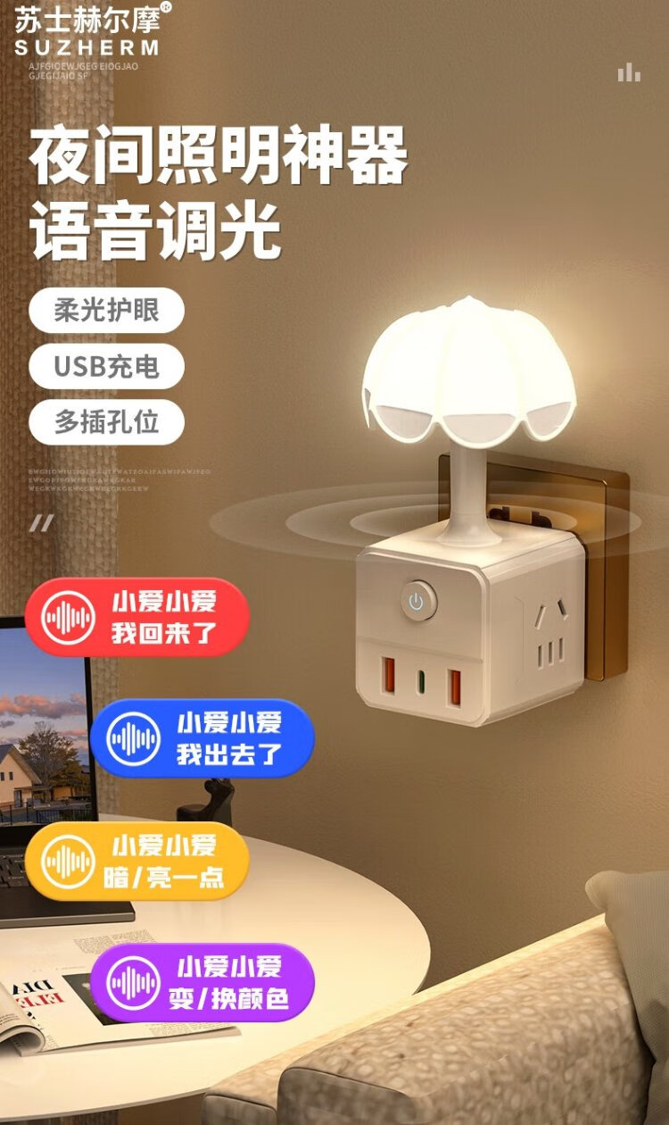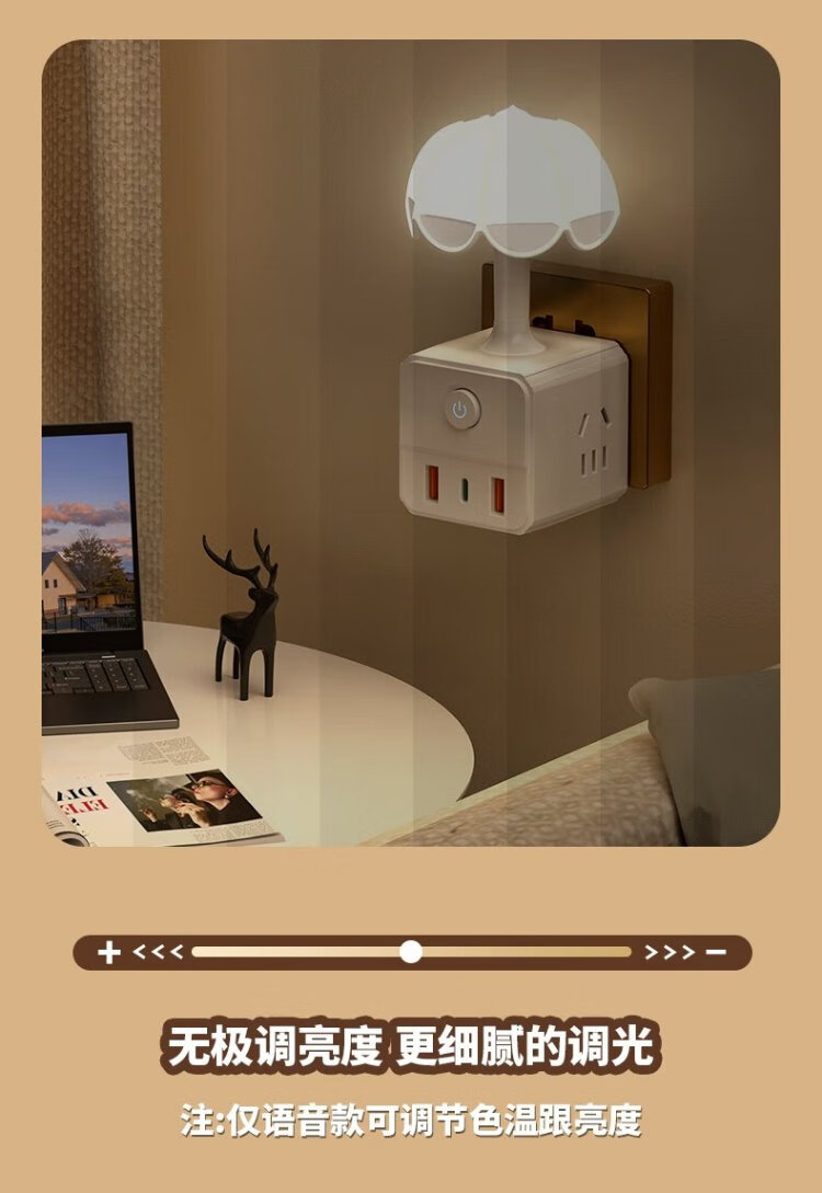苏士赫尔摩【7彩AI声控】欧式温馨夜灯魔方插座 一转多USB+Type-C 无级调光三档色温,卧室氛围充电双场景
