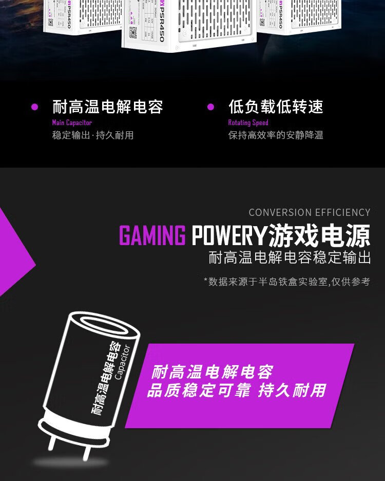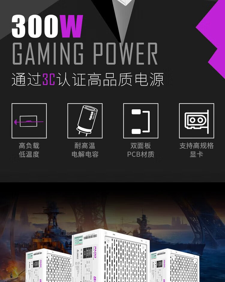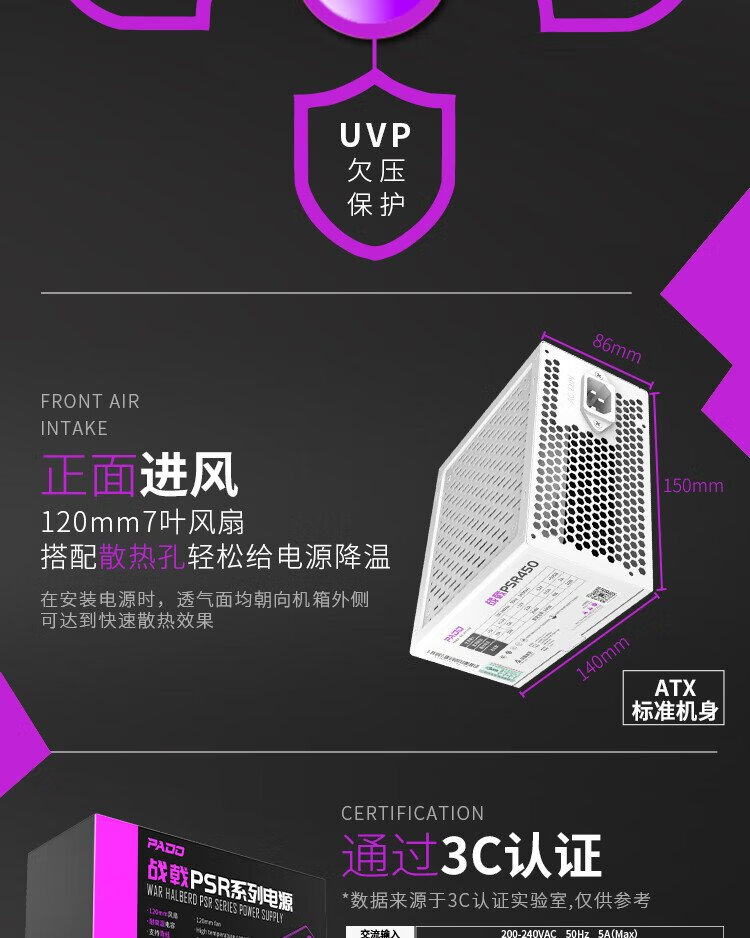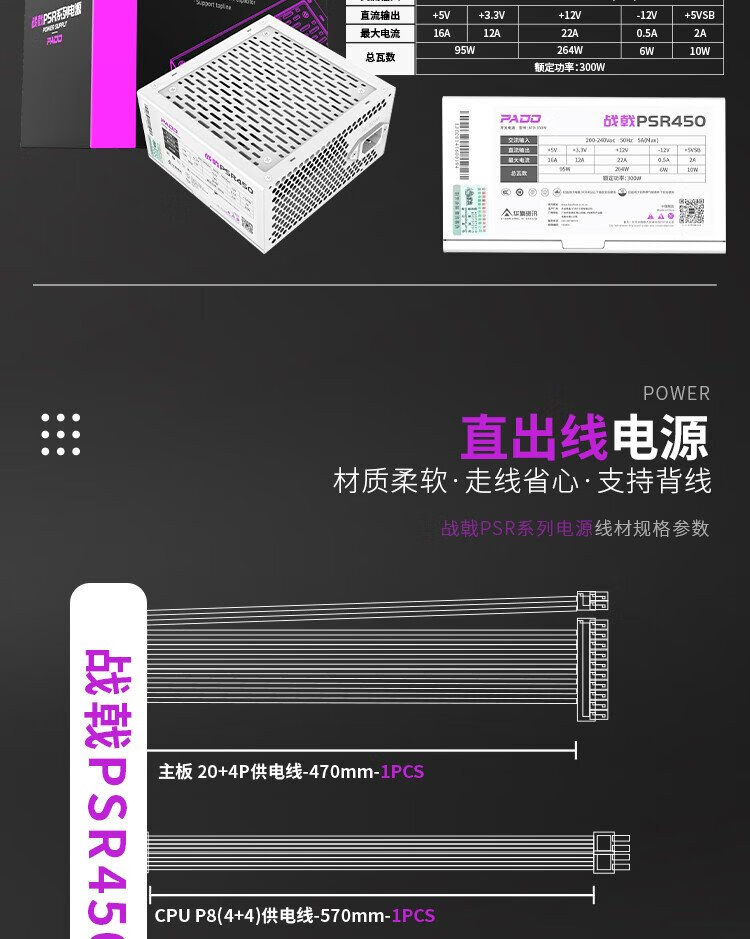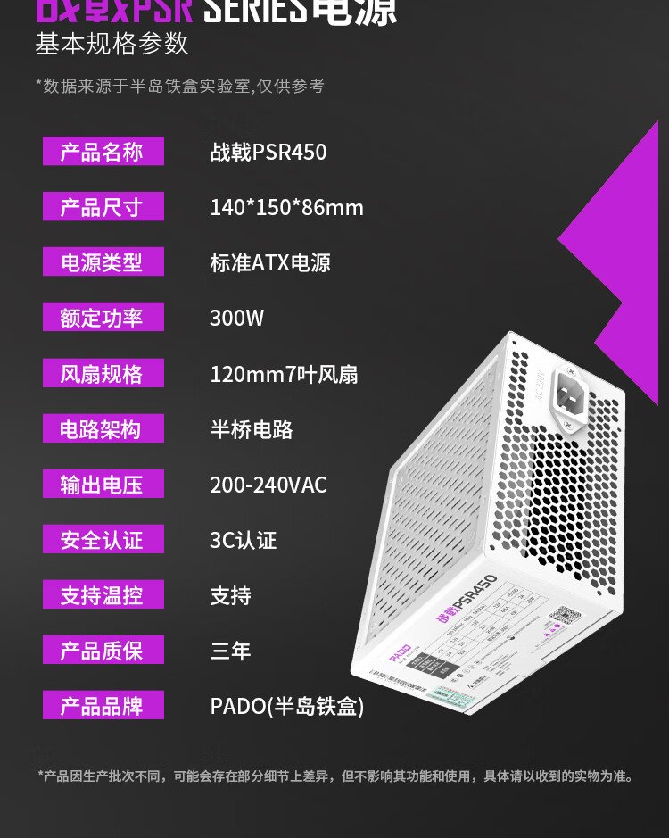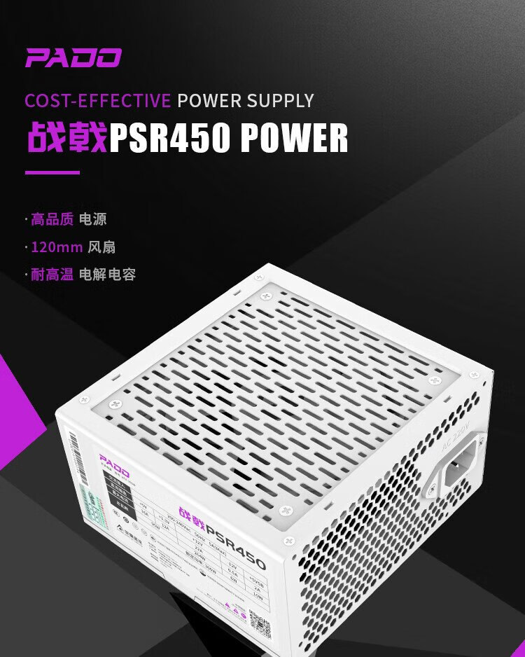 半岛铁盒(PADO)额定300W 战戟PSR450 白色 台式机电脑主机电源(智能温控/多重保护/12CM风扇/支持背线)ATX-350W