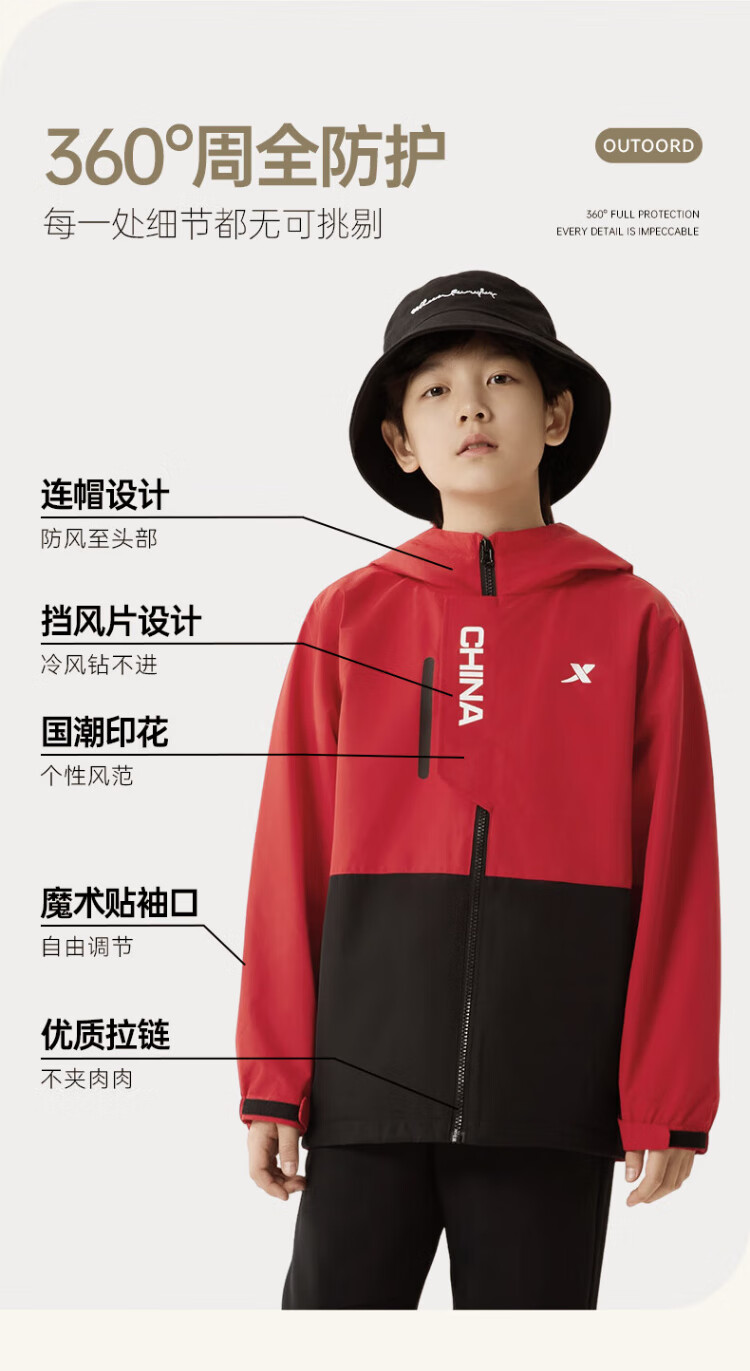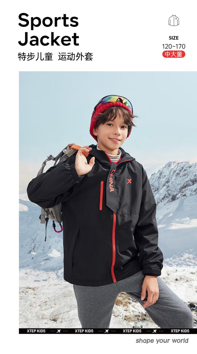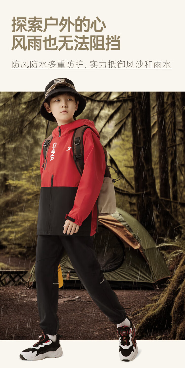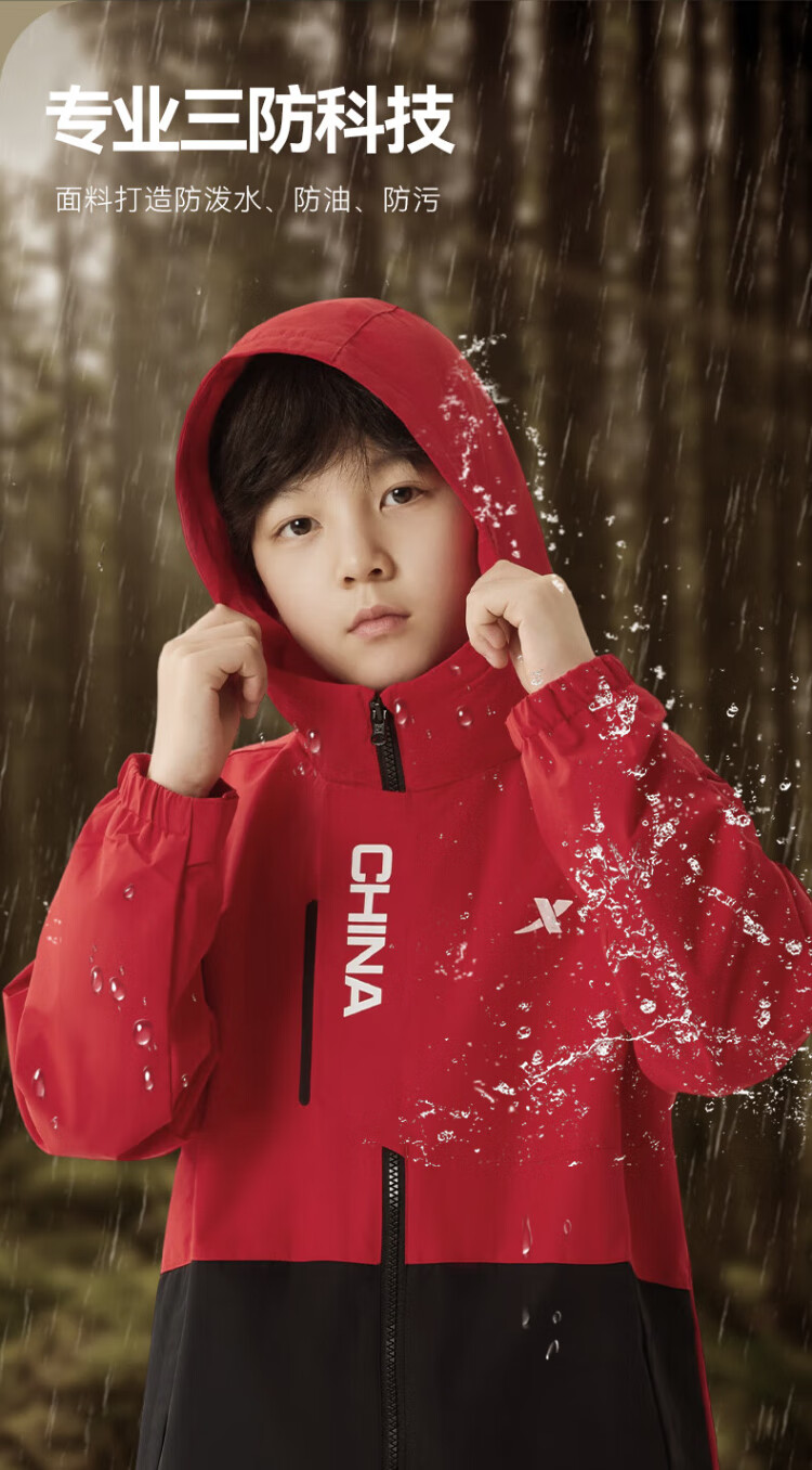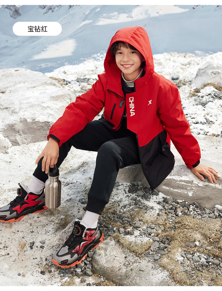 特步儿童童装男童中大童三防拼色摇粒绒时尚保暖风衣 宝钻红 170cm