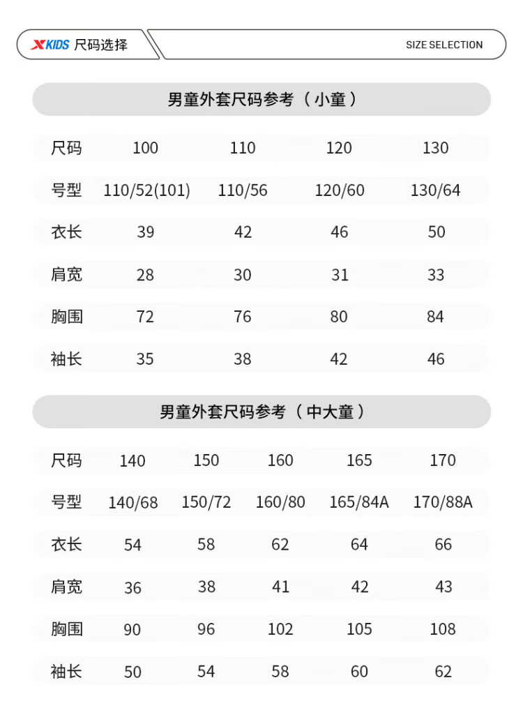 China (cm) 165 / 88-90 170 / 96-98 175 / 108-110 180 / 118-122 185 / 126-130