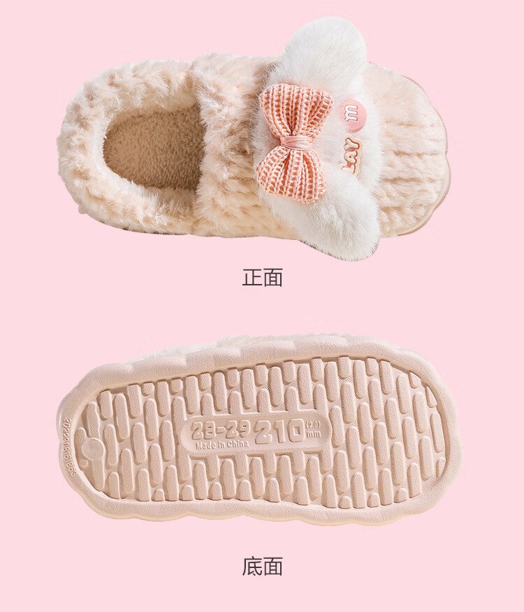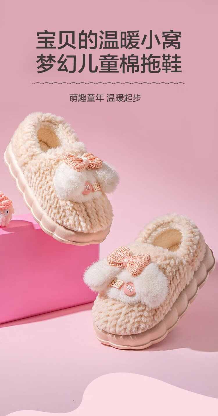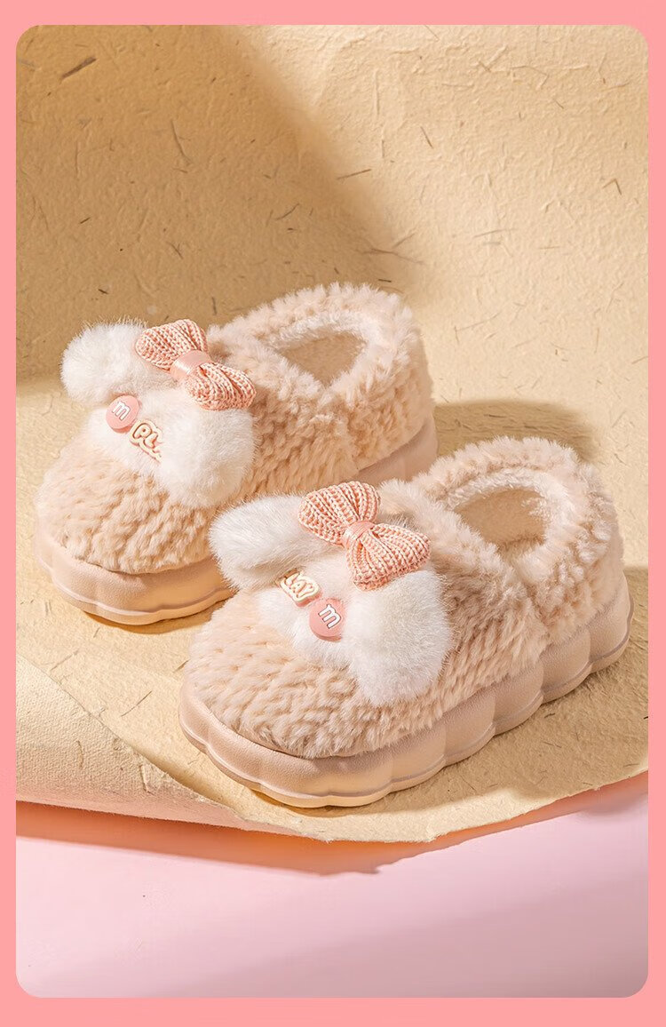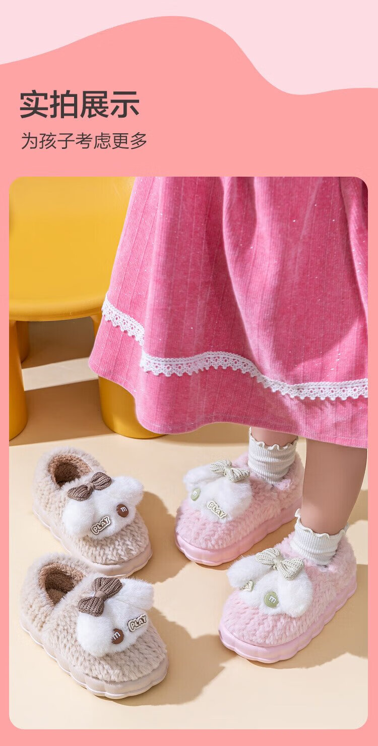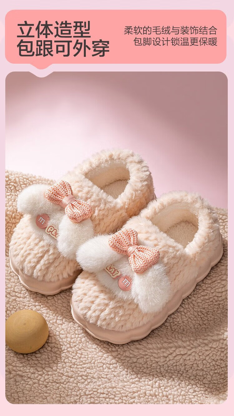 京东京造时尚包脚儿童棉拖鞋男女童毛绒蝴蝶结包跟保暖棉拖鞋卡其色30-31