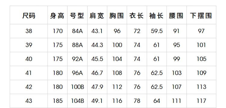 China (cm) 160-165/84-86 165-170 / 88-90 167-172 / 92-96 168-173 / 98-102 170-176 / 106-110