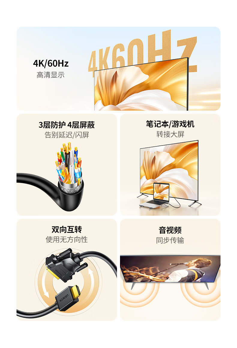 绿联HDMI转DVI连接线4K60Hz DVI转HDMI高清线双向互转笔记本电脑投影仪显示器视频转换线 1米30116