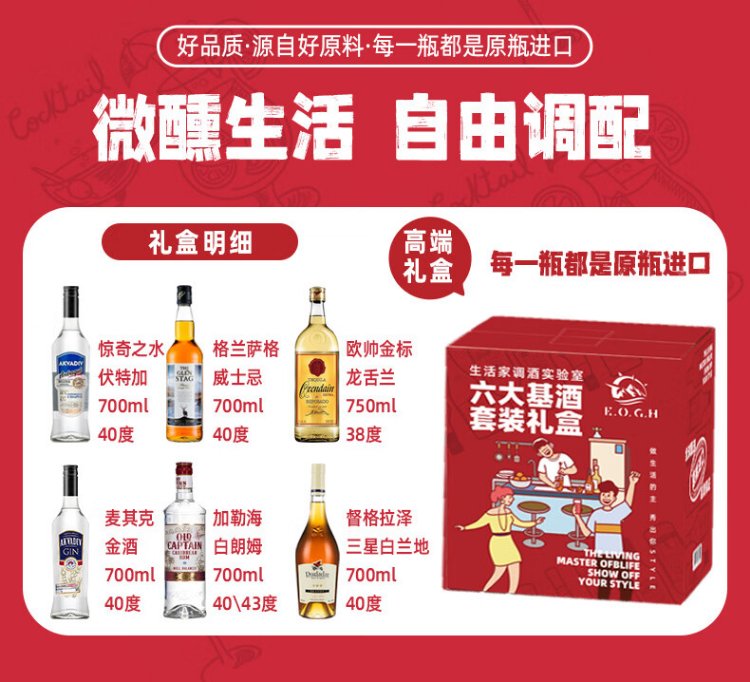 欧帅调酒套装 六大基酒 原装进口洋酒 调酒基酒套装全套 700mL 礼盒装