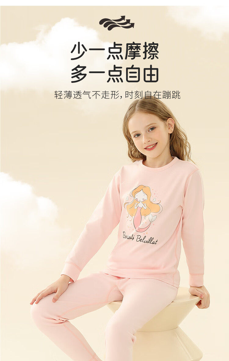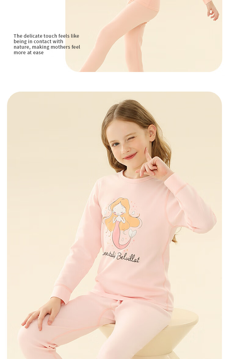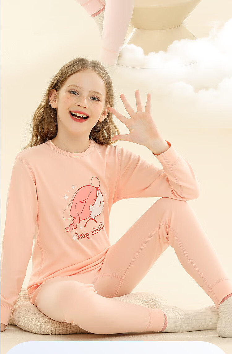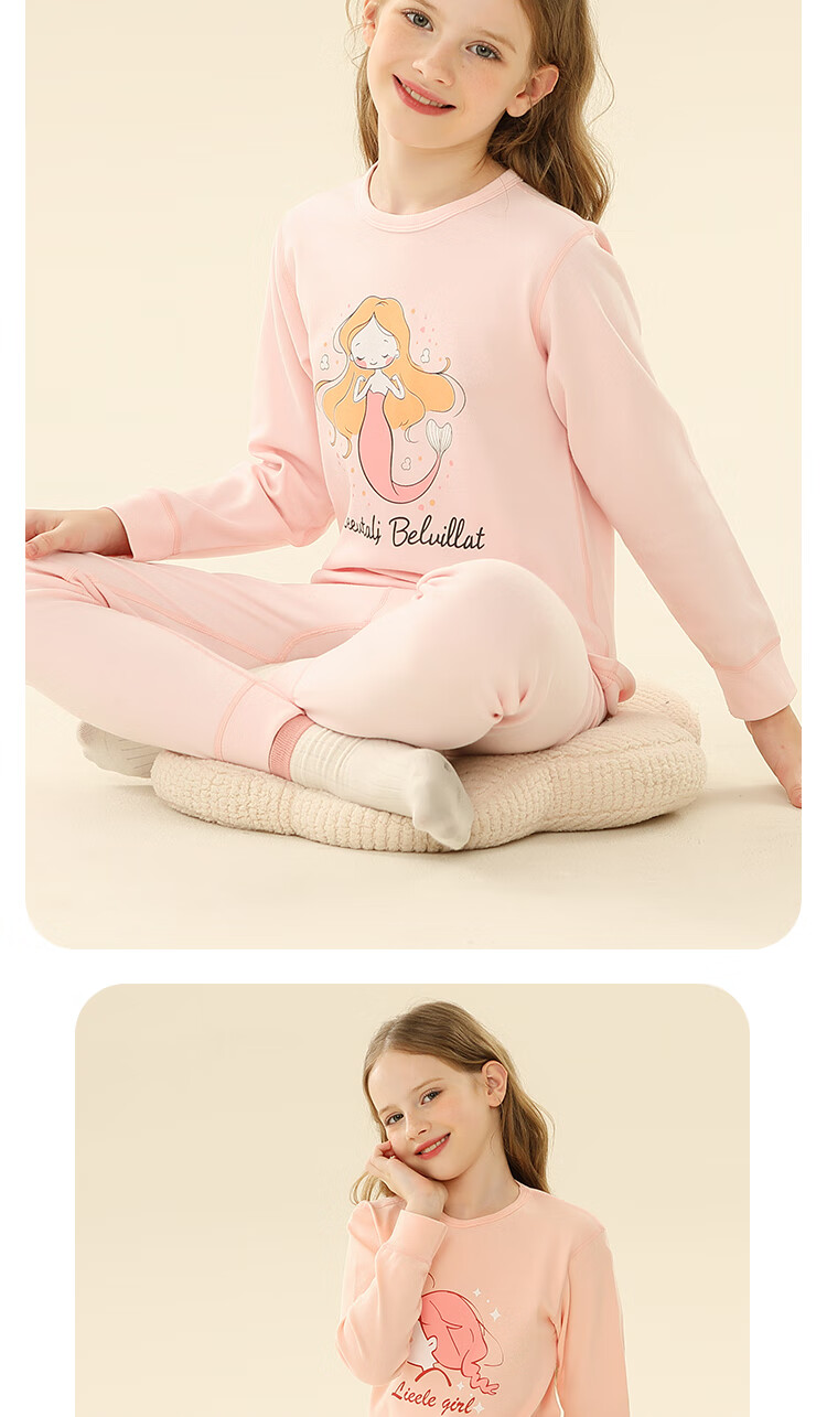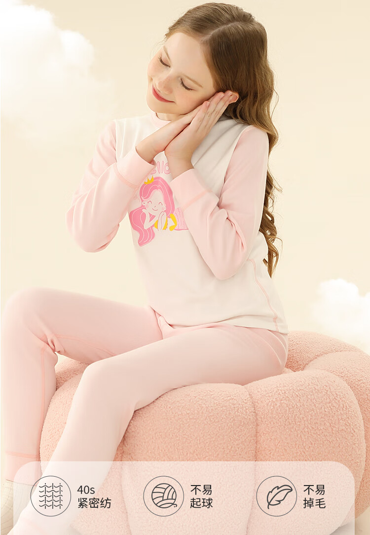 猫人儿童保暖内女童【100%棉】圆领秋衣秋裤女宝宝秋冬睡衣棉毛衫套装