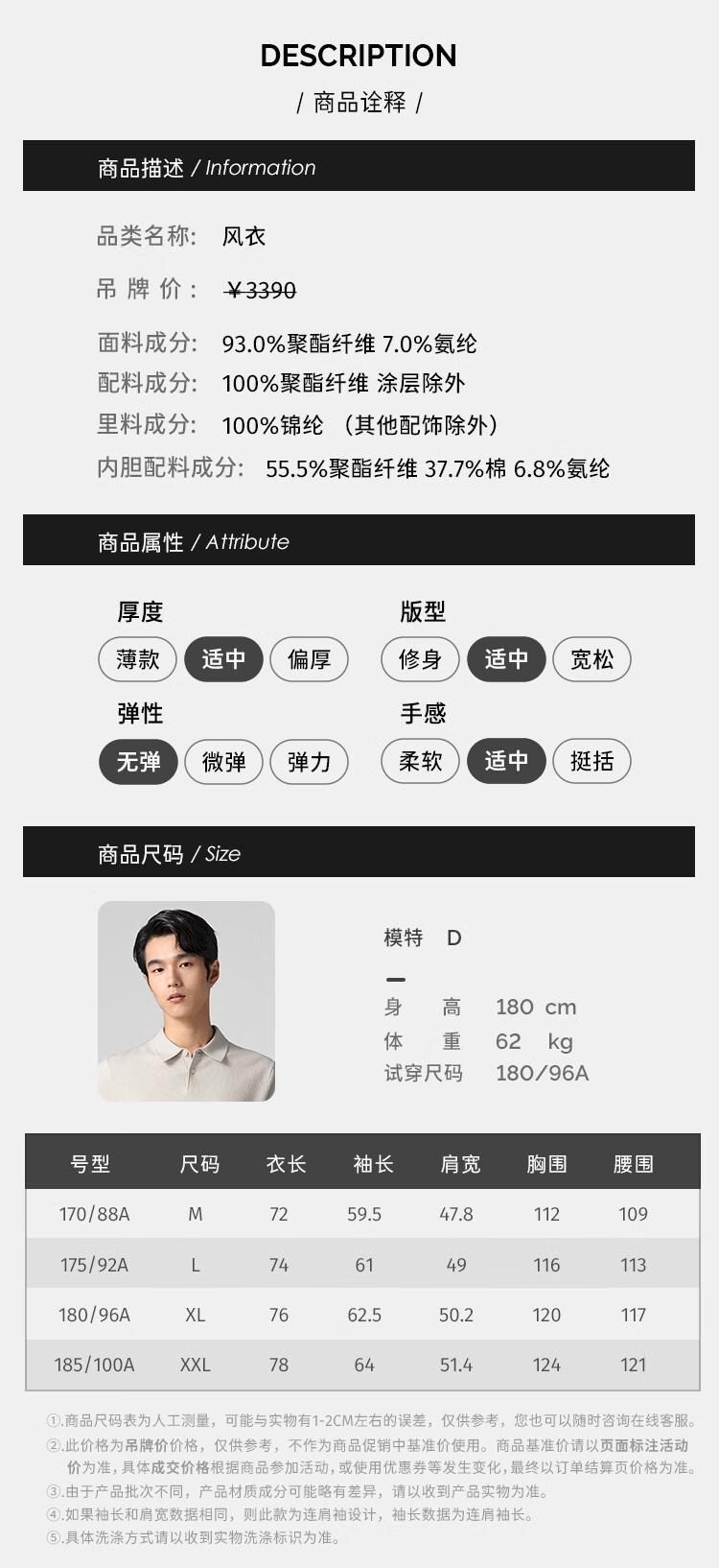 China (cm) 165 / 88-90 170 / 96-98 175 / 108-110 180 / 118-122 185 / 126-130