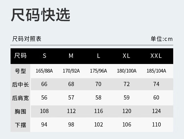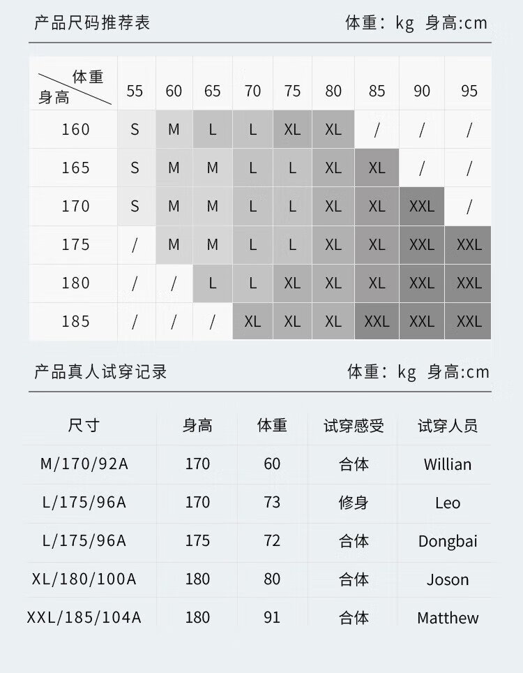 China (cm) 165 / 88-90 170 / 96-98 175 / 108-110 180 / 118-122 185 / 126-130