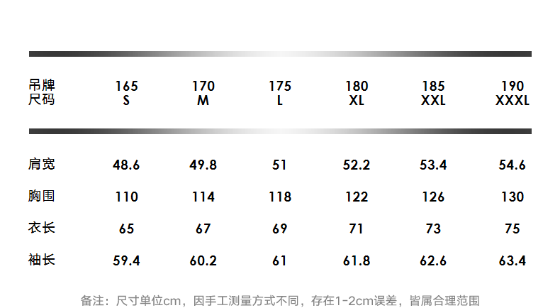 China (cm) 165 / 88-90 170 / 96-98 175 / 108-110 180 / 118-122 185 / 126-130