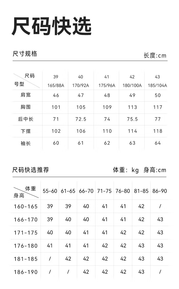 China (cm) 160-165/84-86 165-170 / 88-90 167-172 / 92-96 168-173 / 98-102 170-176 / 106-110