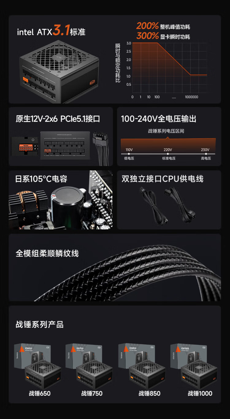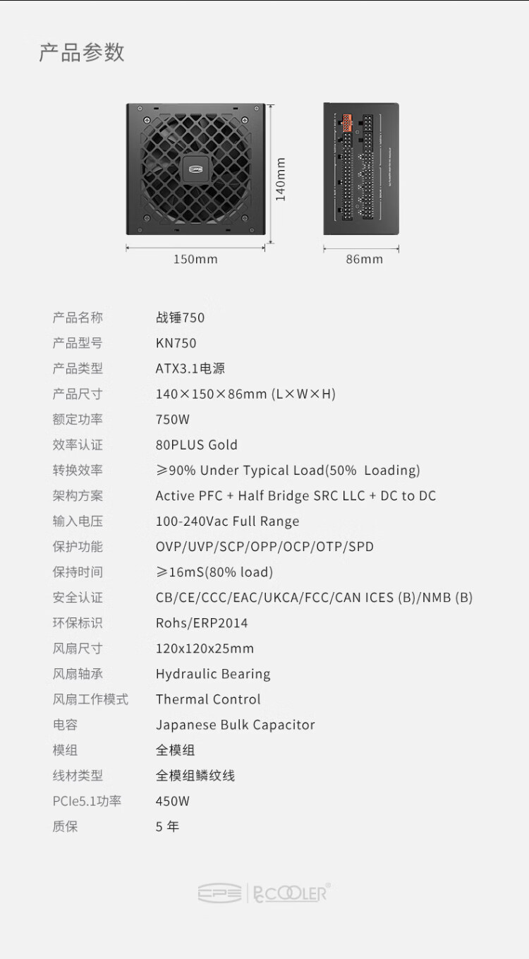 Overclocking 3 (PCCOOLER) rated 750W Warhammer KN750 gold medal full module ATX3.1 power supply 14CM small body Japanese main capacitor five-year warranty