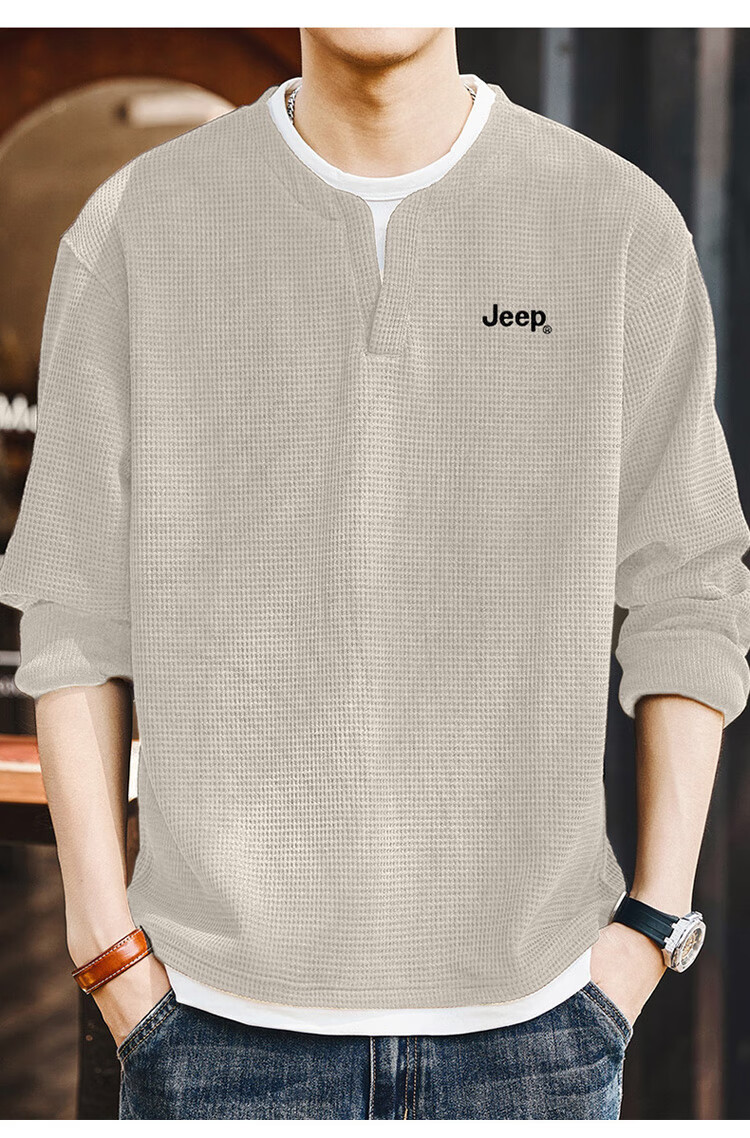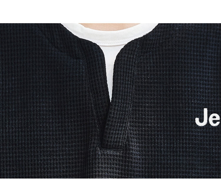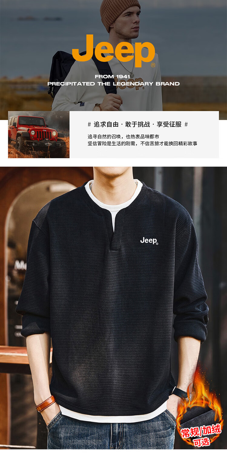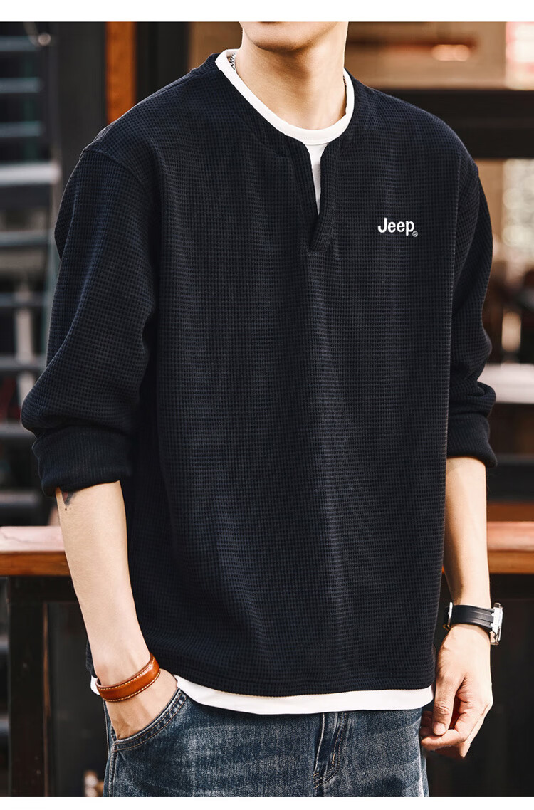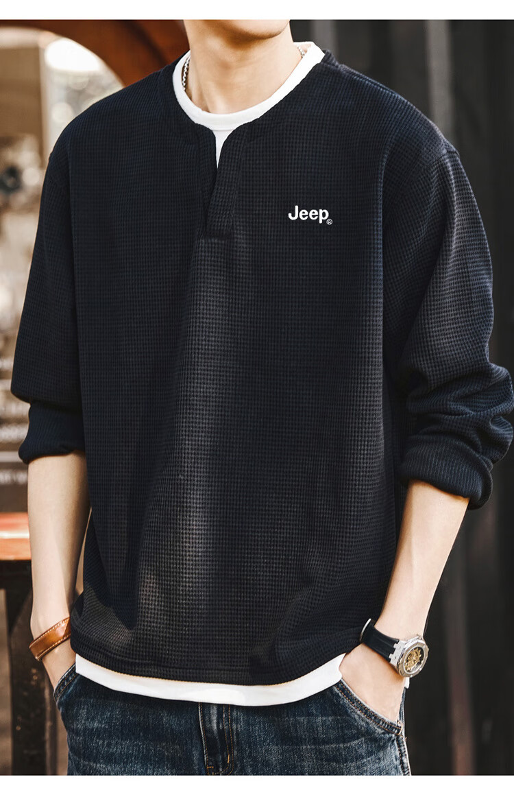 Jeep (JEEP) sweatshirt men's autumn and winter heavyweight waffle fake two-piece bottoming shirt top men's black XL