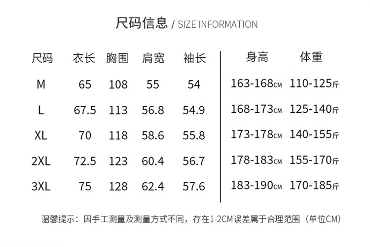 China (cm) 165 / 88-90 170 / 96-98 175 / 108-110 180 / 118-122 185 / 126-130