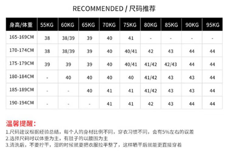 China (cm) 165 / 88-90 170 / 96-98 175 / 108-110 180 / 118-122 185 / 126-130
