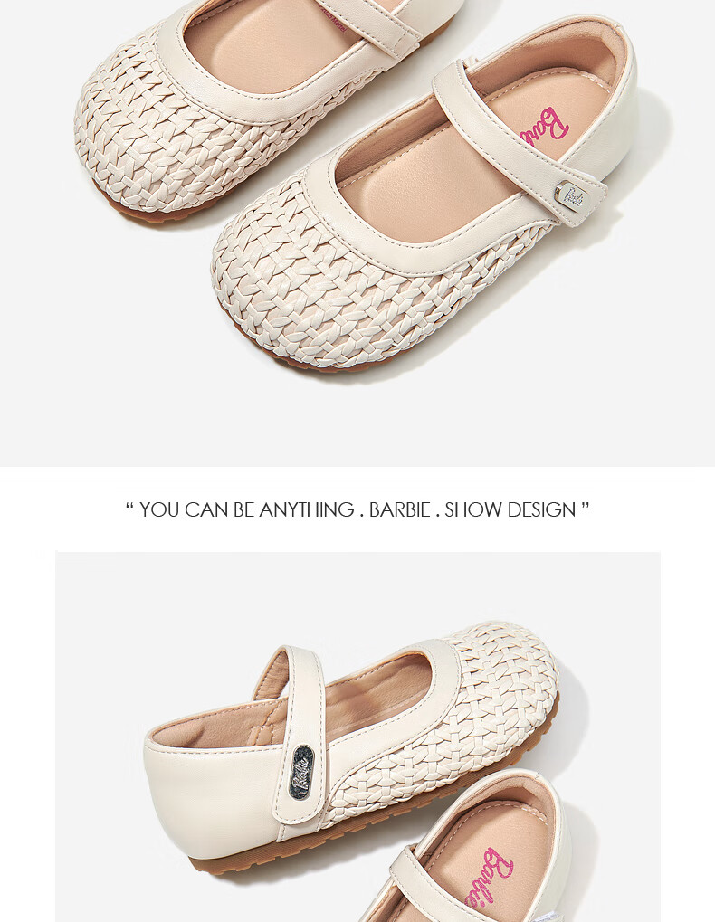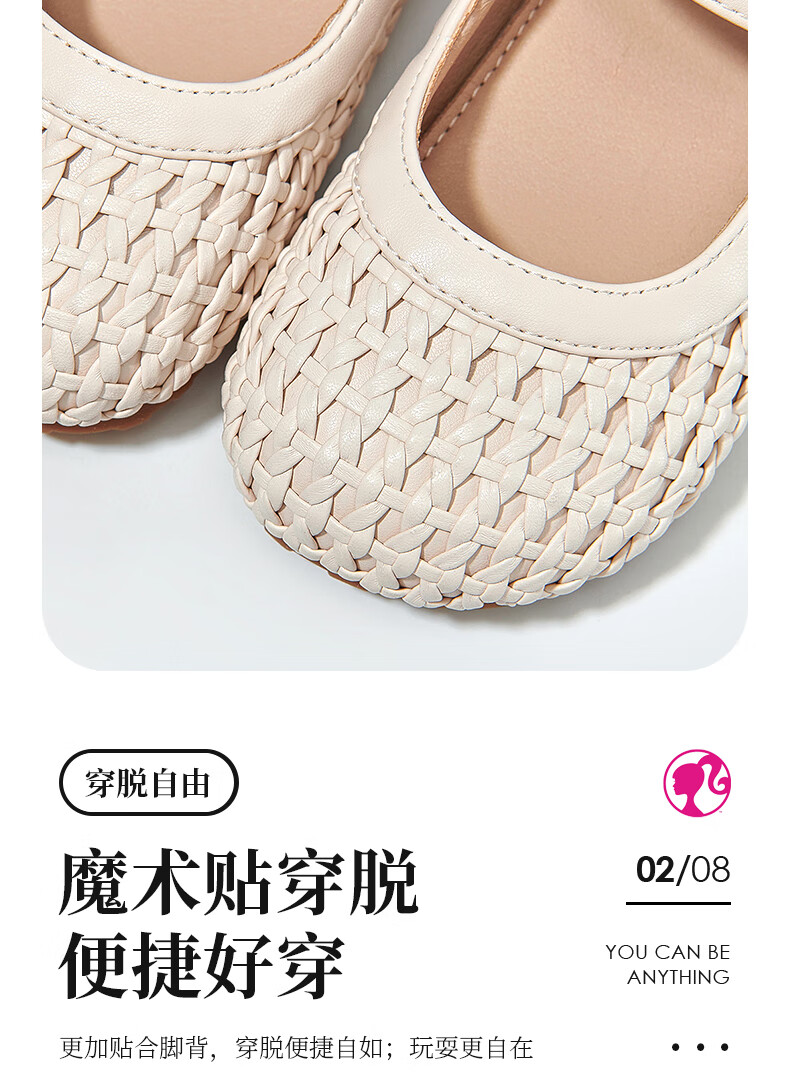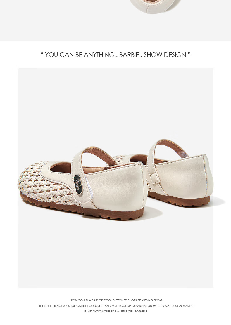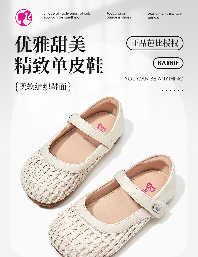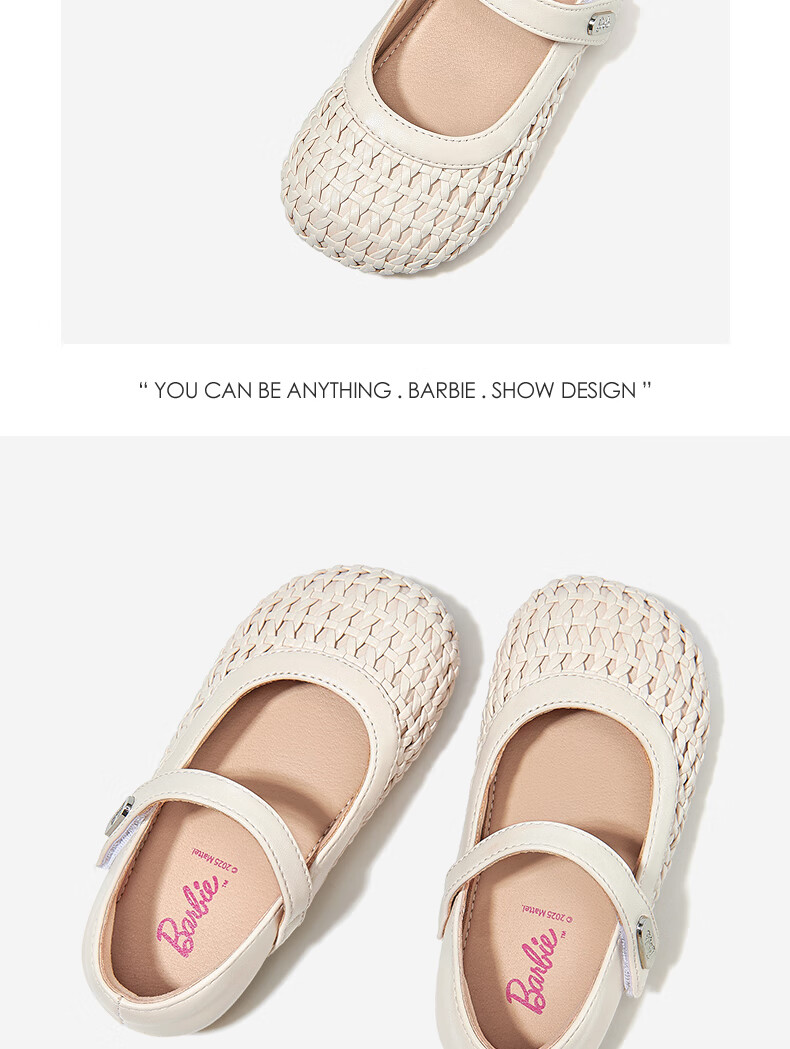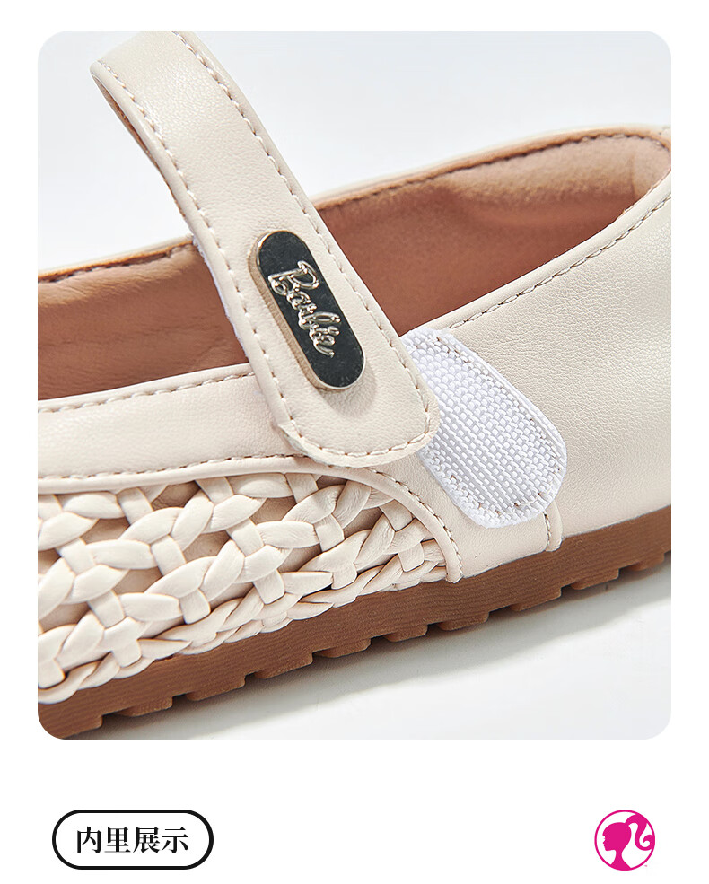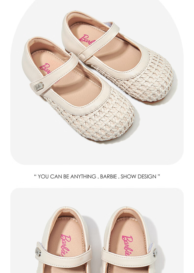 芭比儿童鞋子女童春秋编织皮鞋小女孩时尚包头公主鞋DA6916 米白 30