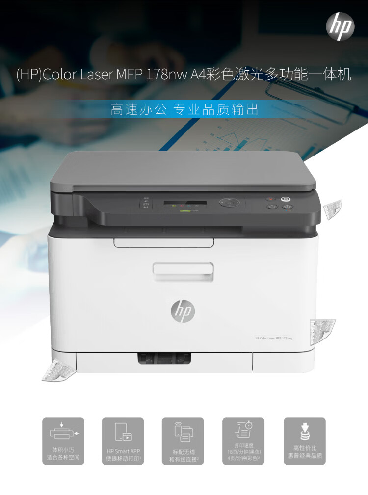 惠普(HP)178nw彩色激光多功能一体机无线打印机 家用打作业 打印复印扫描 2年送修版
