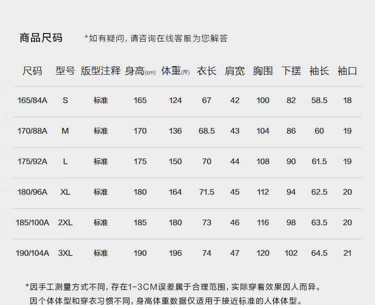 China (cm) 160-165/84-86 165-170 / 88-90 167-172 / 92-96 168-173 / 98-102 170-176 / 106-110