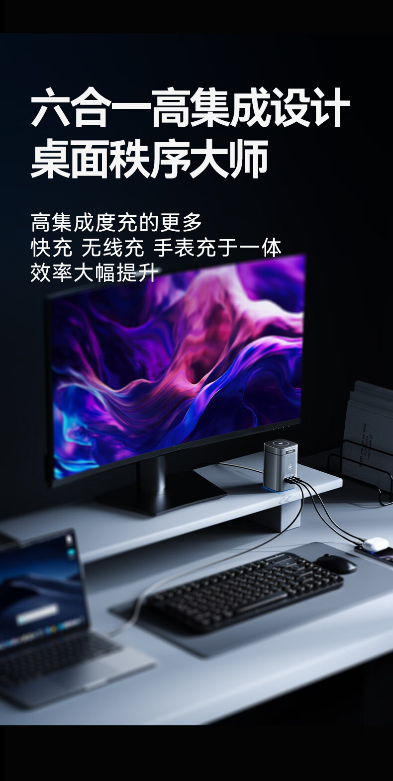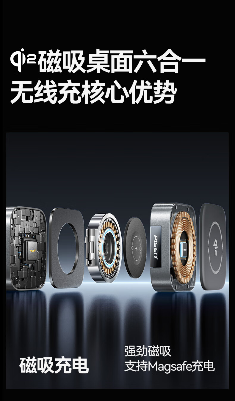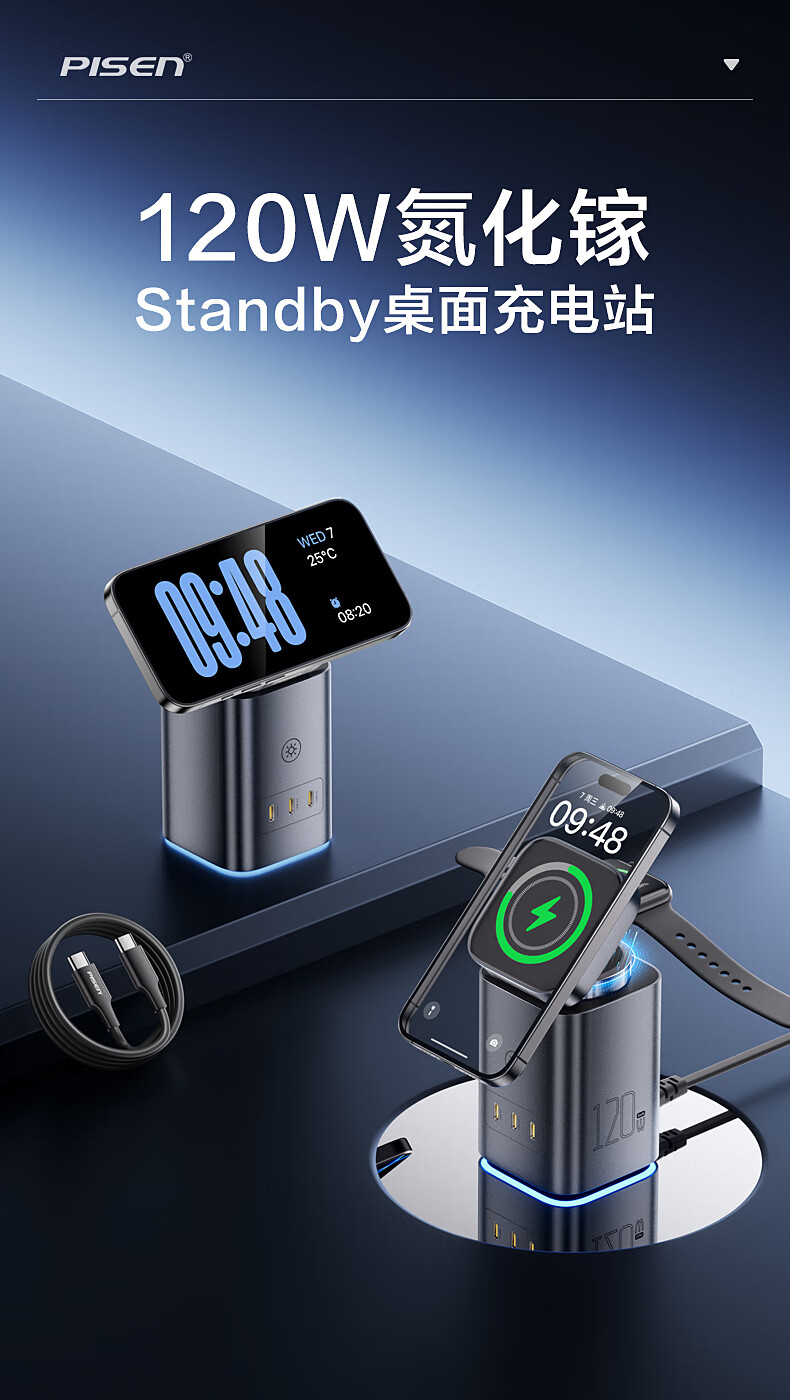 Pinsheng 120W gallium nitride desktop charger station qi2 wireless charging magnetic suction Type-C multi-port fast charging 100W socket suitable for Apple 17/16 Huawei mobile phone computer headphone watch
