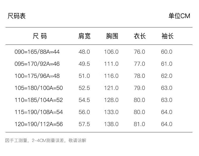 China (cm) 160-165/84-86 165-170 / 88-90 167-172 / 92-96 168-173 / 98-102 170-176 / 106-110