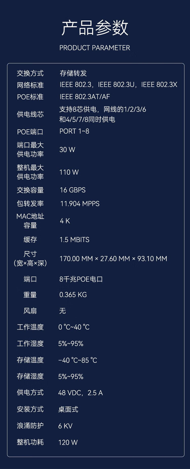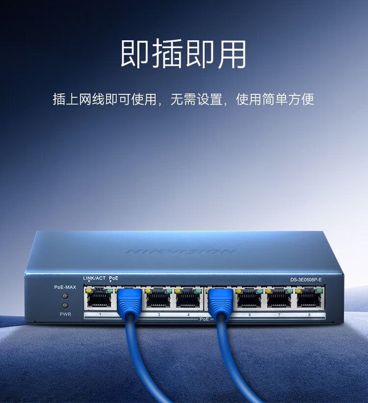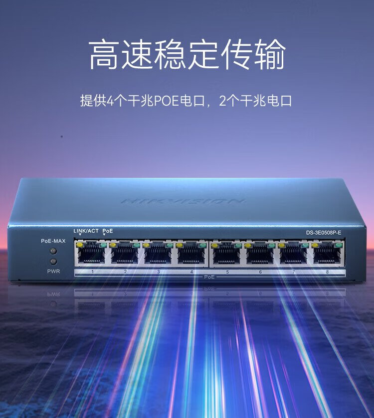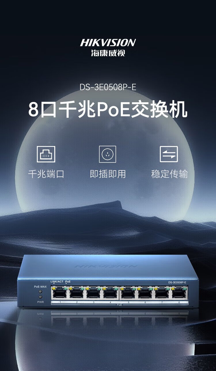HIKVISION海康威视8口全千兆交换机POE网线供电非网管防雷网络集线分线器金属外壳散热DS-3E0508P-E