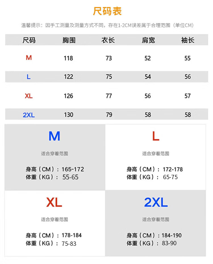 China (cm) 165 / 88-90 170 / 96-98 175 / 108-110 180 / 118-122 185 / 126-130
