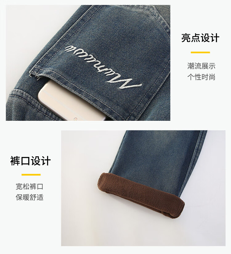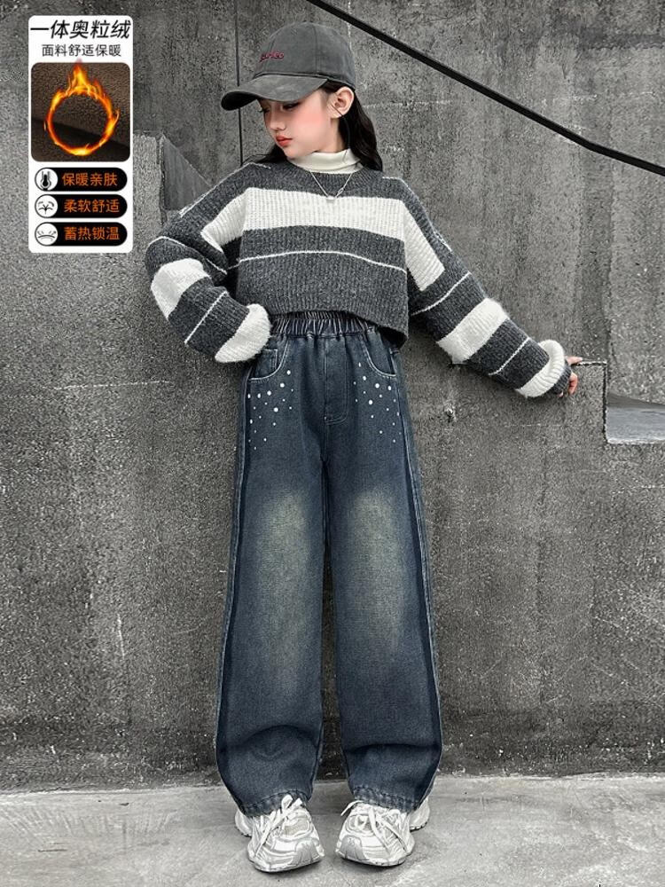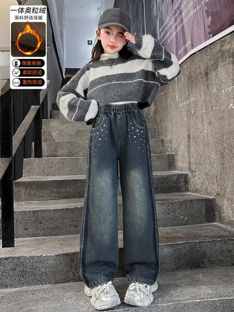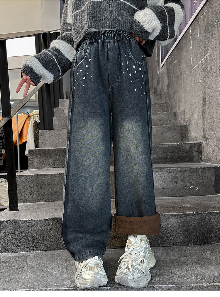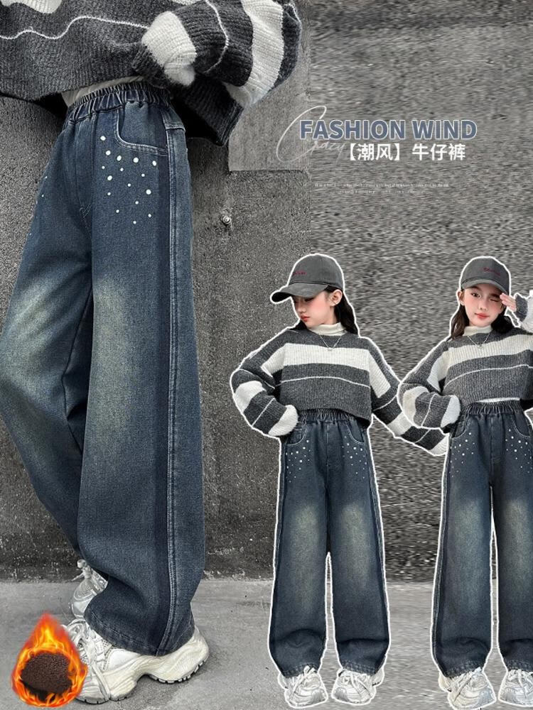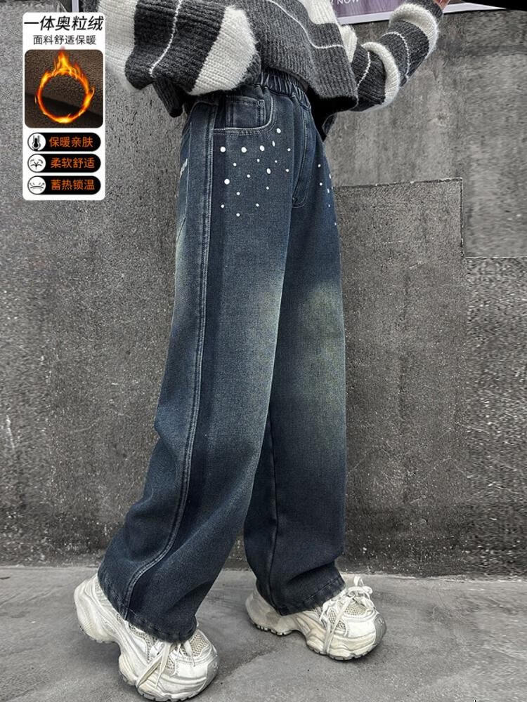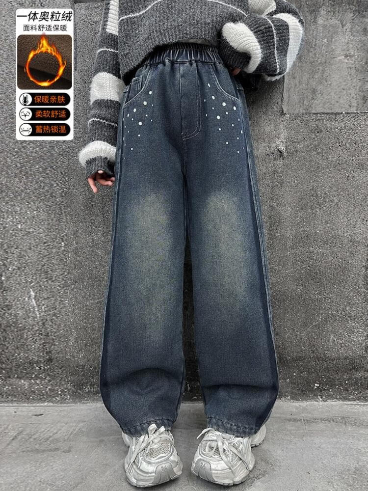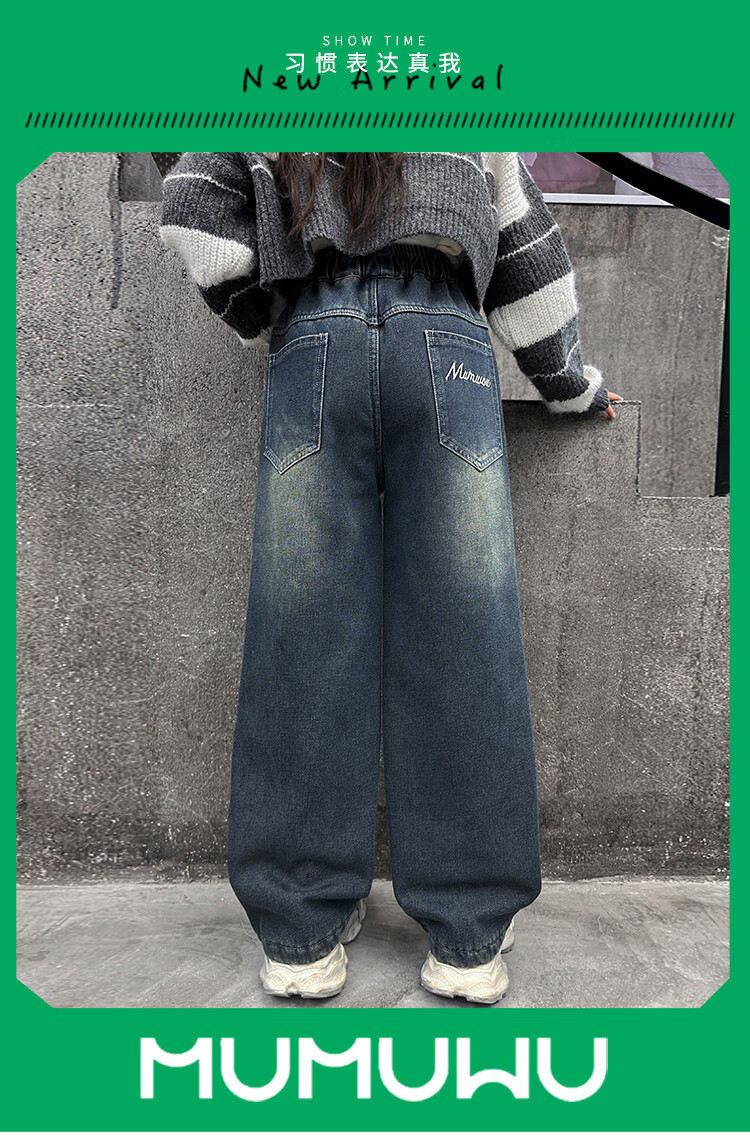 木木屋(mumuwu)女童加绒加厚牛仔裤秋冬款儿童中大童宽松休闲裤女孩保暖直筒裤子