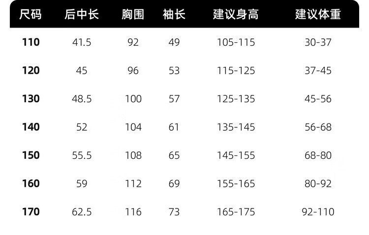 China (cm) 160-165/84-86 165-170 / 88-90 167-172 / 92-96 168-173 / 98-102 170-176 / 106-110