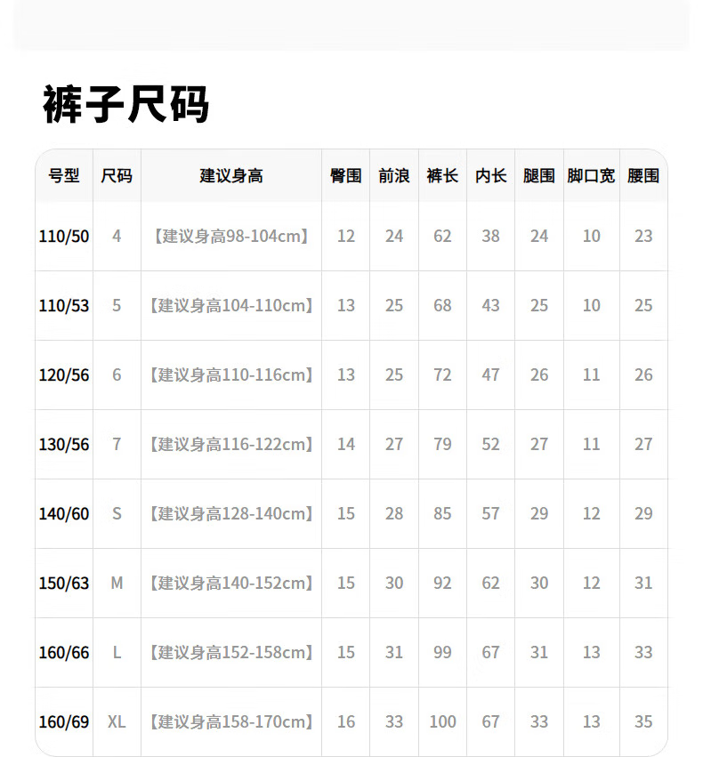 China (cm) 160-165/84-86 165-170 / 88-90 167-172 / 92-96 168-173 / 98-102 170-176 / 106-110