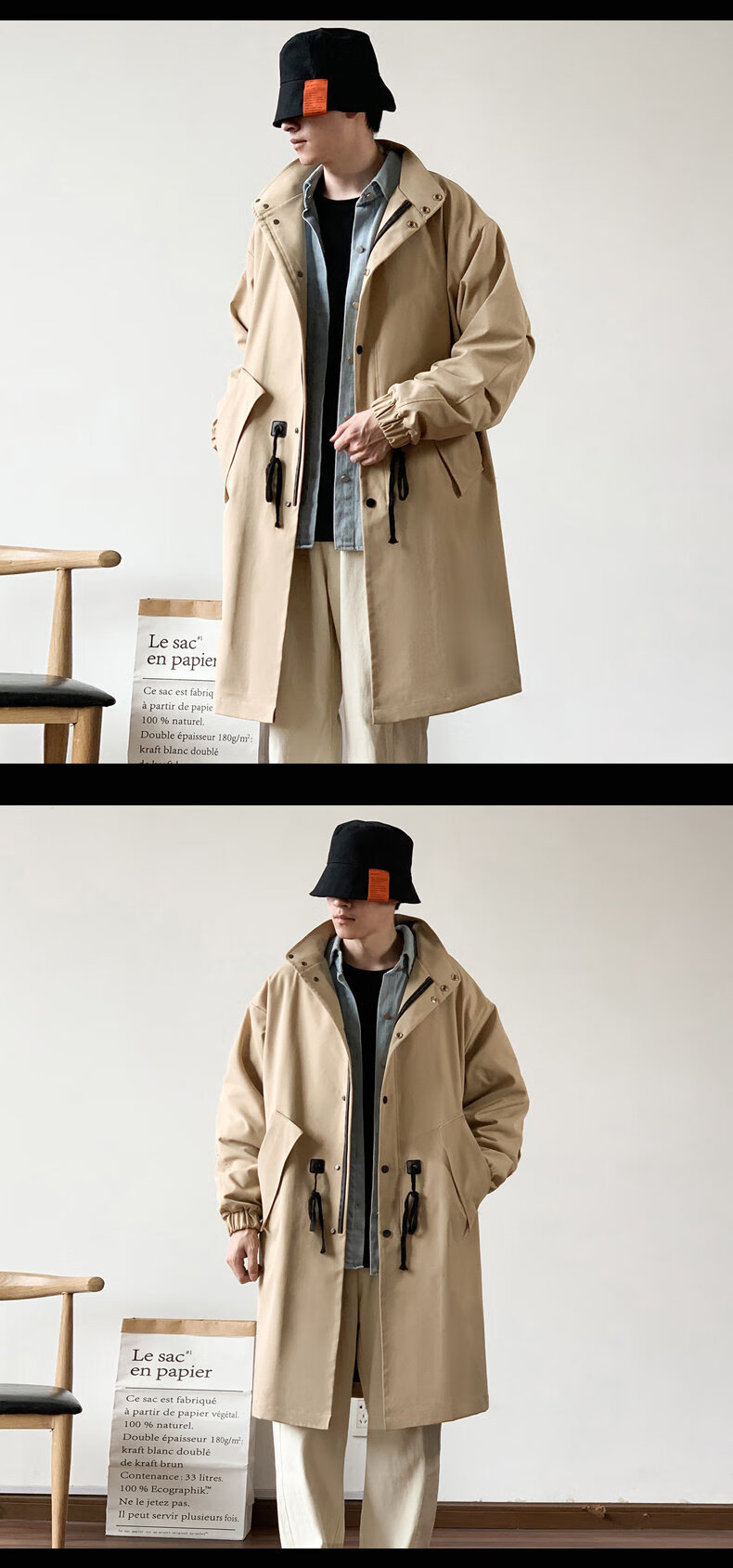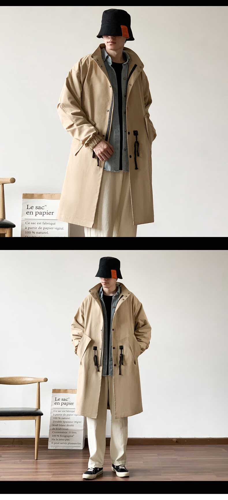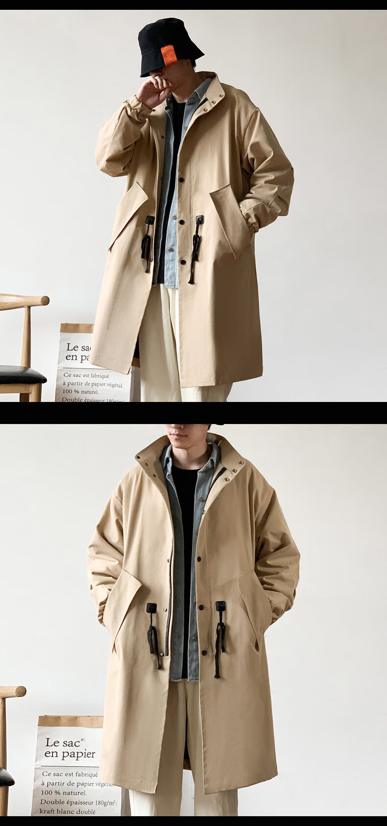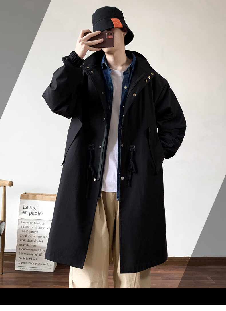 JEEP SPIRIT吉普日系抽绳收腰中长款风衣男秋季外套宽松休闲大衣卡其色XL