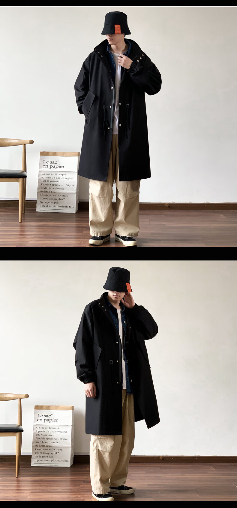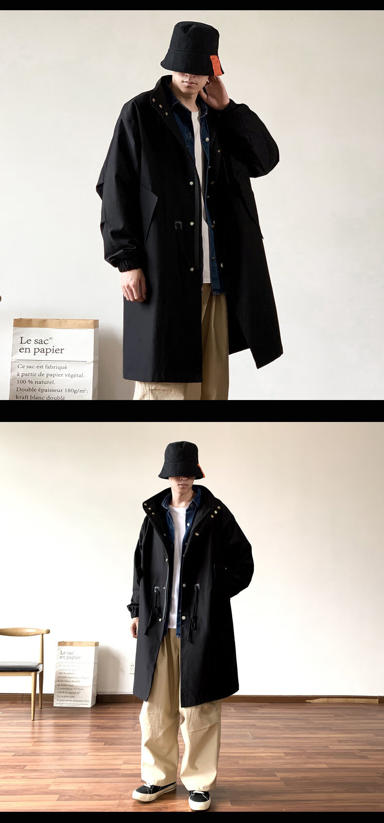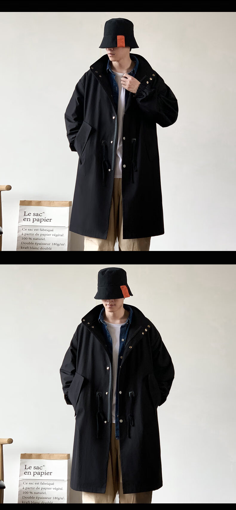 JEEP SPIRIT吉普日系抽绳收腰中长款风衣男秋季外套宽松休闲大衣卡其色XL