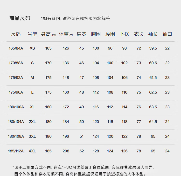 China (cm) 165 / 88-90 170 / 96-98 175 / 108-110 180 / 118-122 185 / 126-130