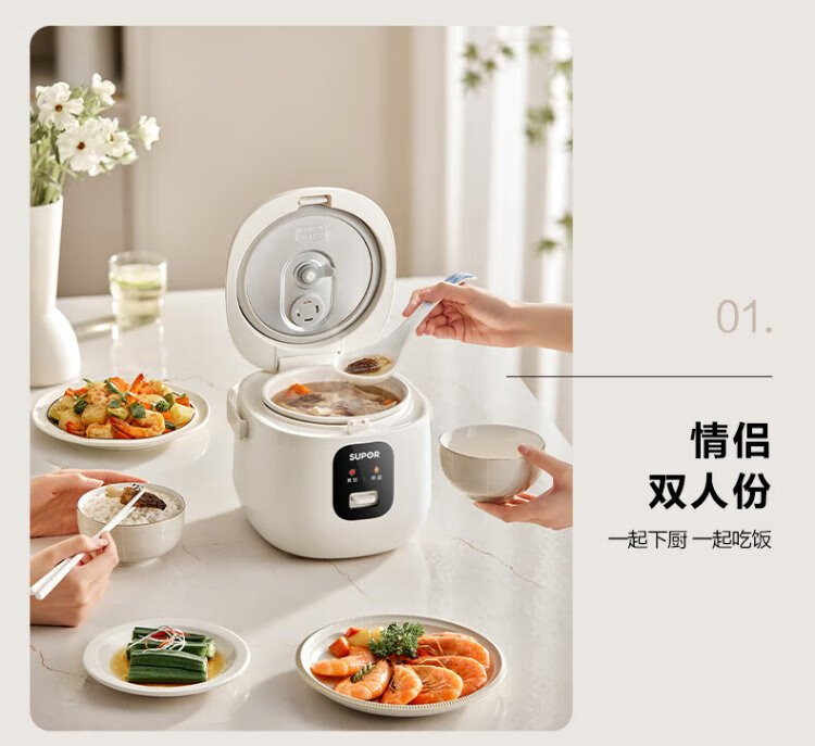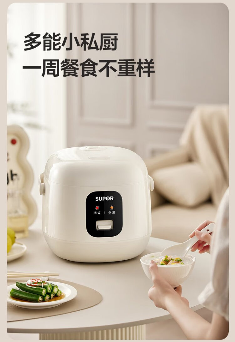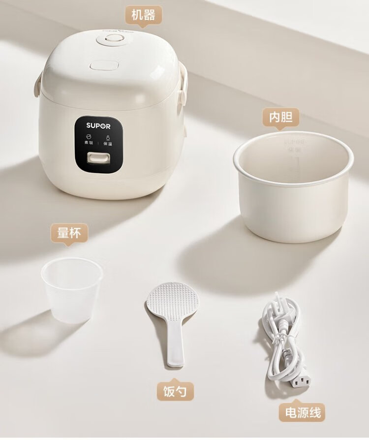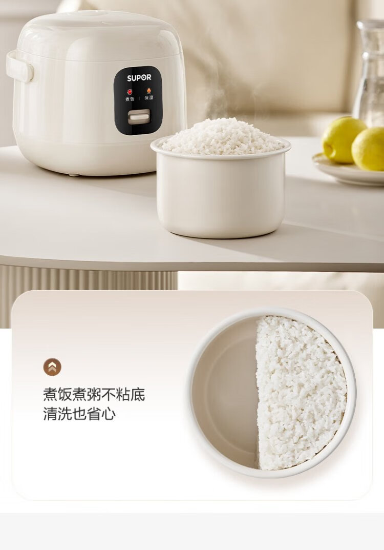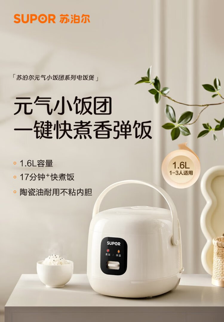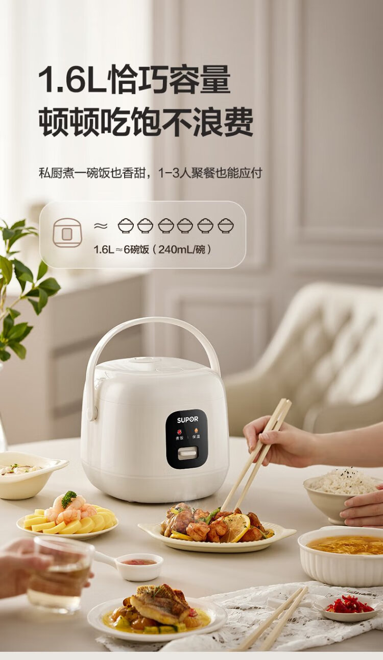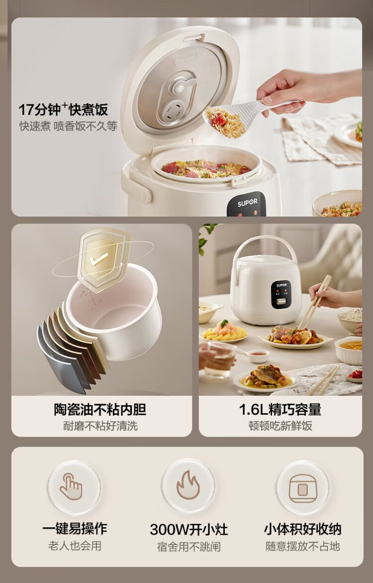 SUPOR Olla arrocera pequeña para 1-2 Personas, Olla Interior Antiadherente de cerámica de 1,6 litros, cocción rápida, Gachas de Mijo, Arroz al Vapor, Mini Olla arrocera de micropresión pequeña Multifuncional Inteligente para Dormitorio F16R71