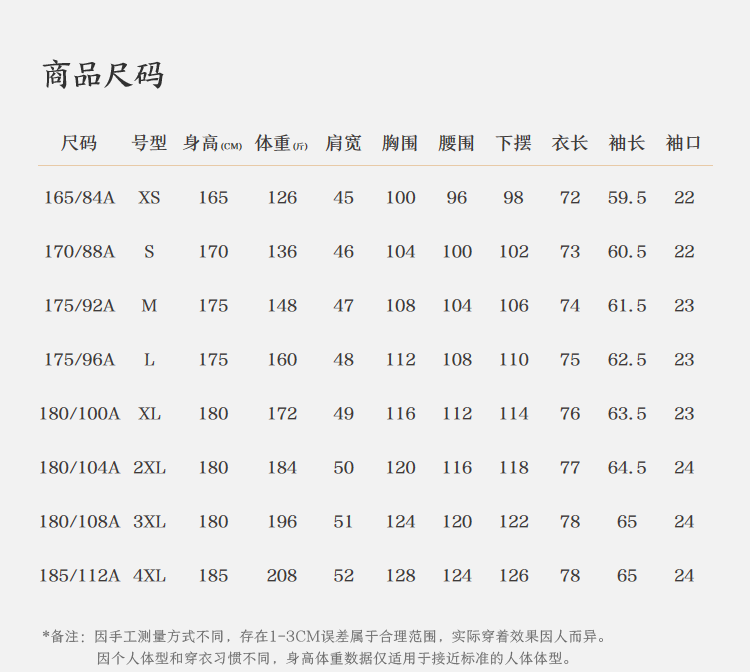 China (cm) 160-165/84-86 165-170 / 88-90 167-172 / 92-96 168-173 / 98-102 170-176 / 106-110