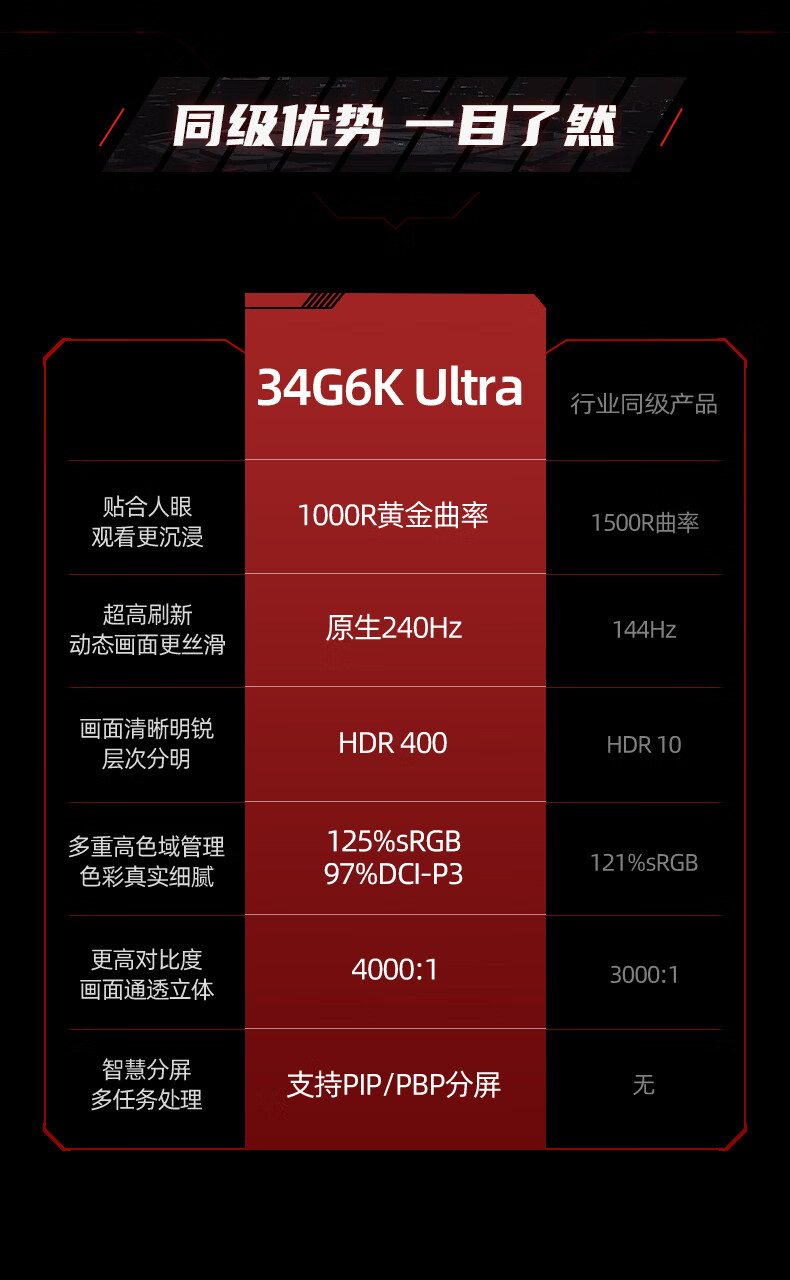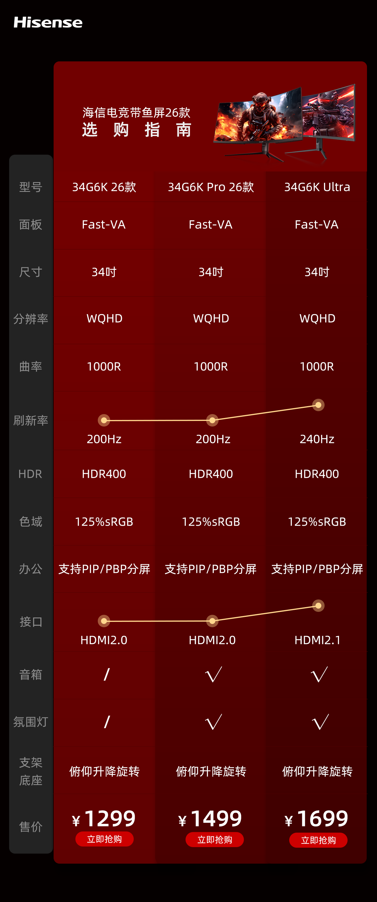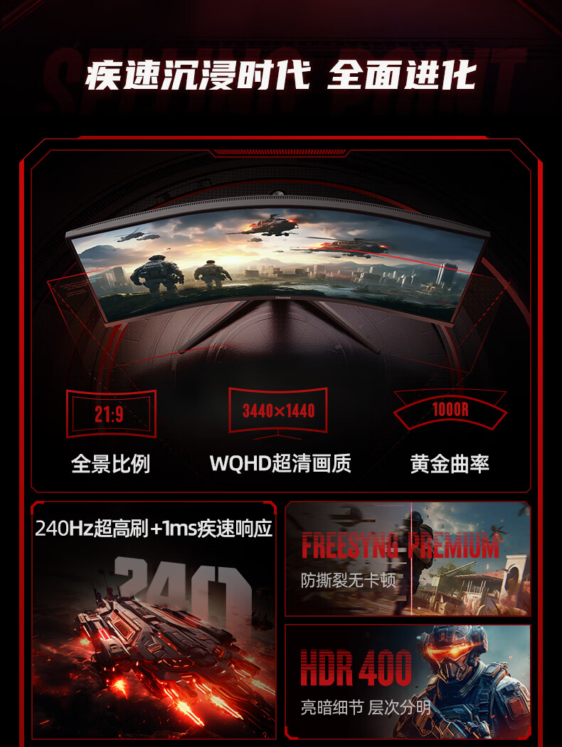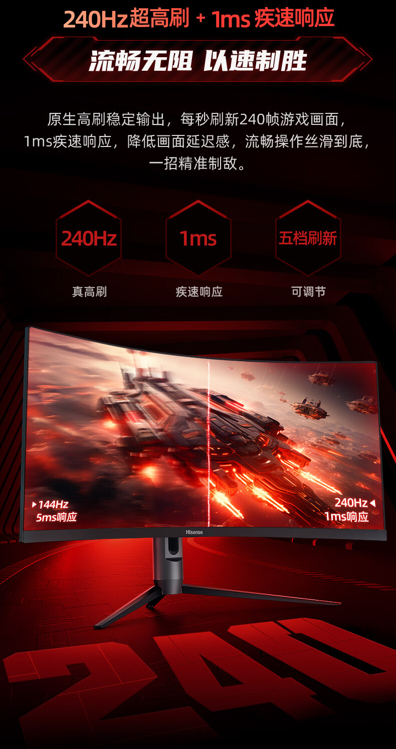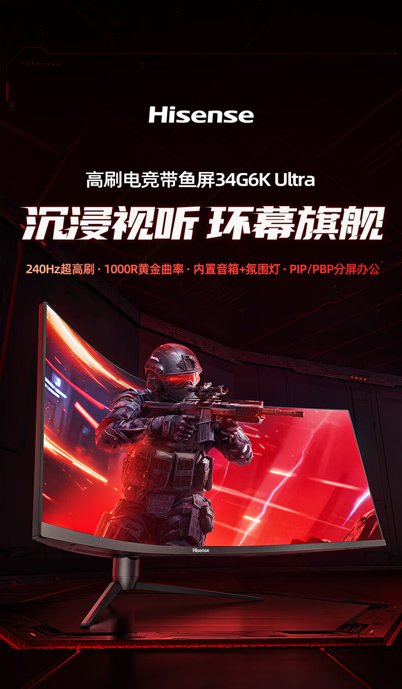 Hisense 34-inch fish screen display 240Hz high brush 1000R curvature built-in audio HDR400 WQHD curved gaming screen 34G6K Ultra