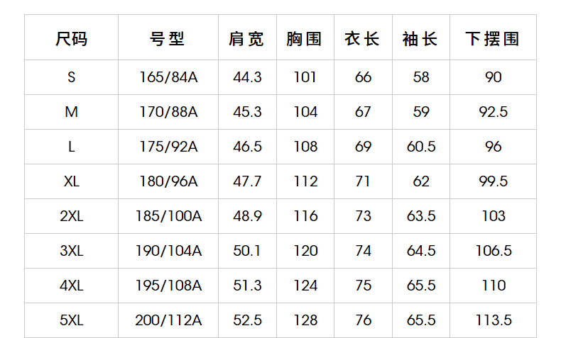 China (cm) 160-165/84-86 165-170 / 88-90 167-172 / 92-96 168-173 / 98-102 170-176 / 106-110