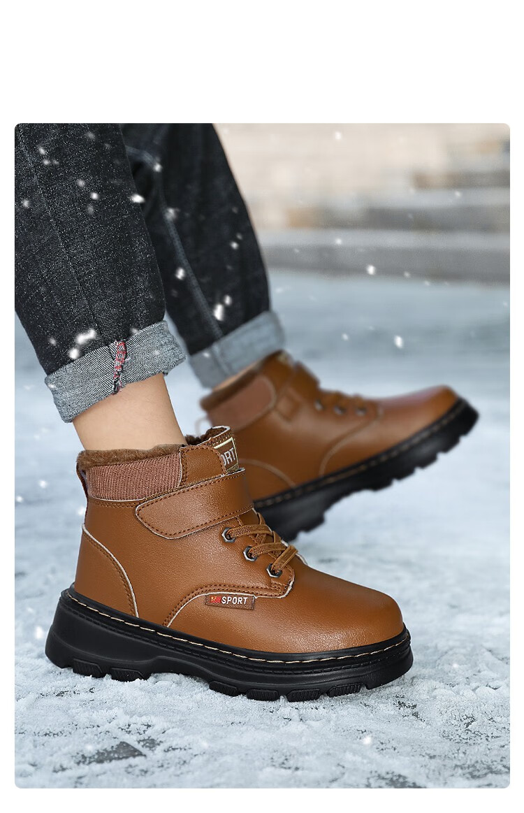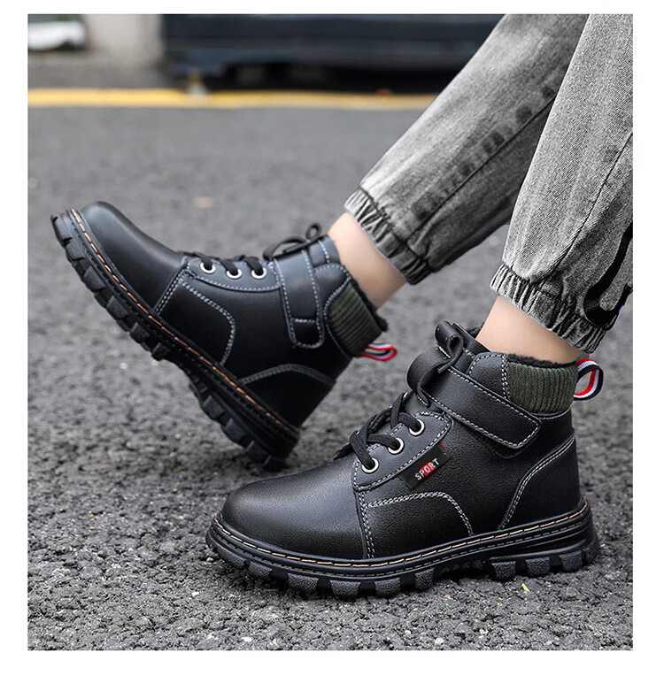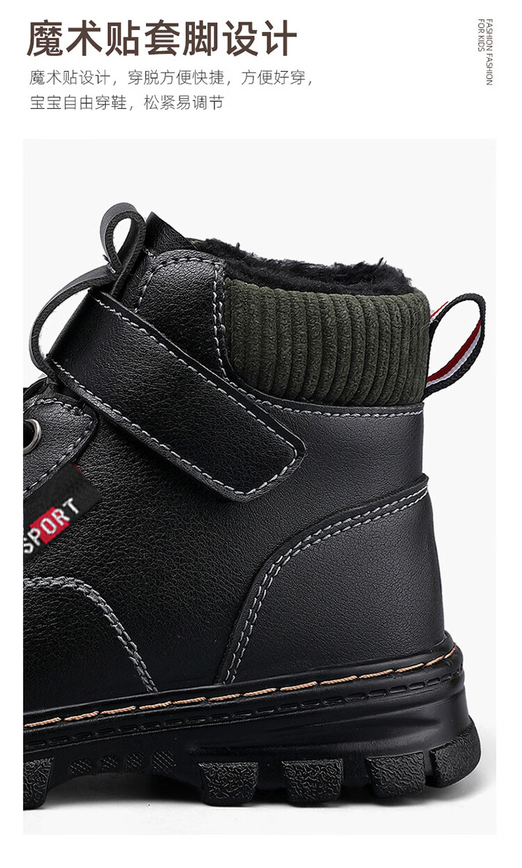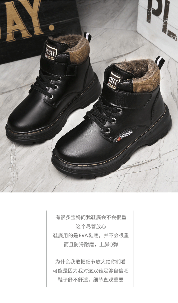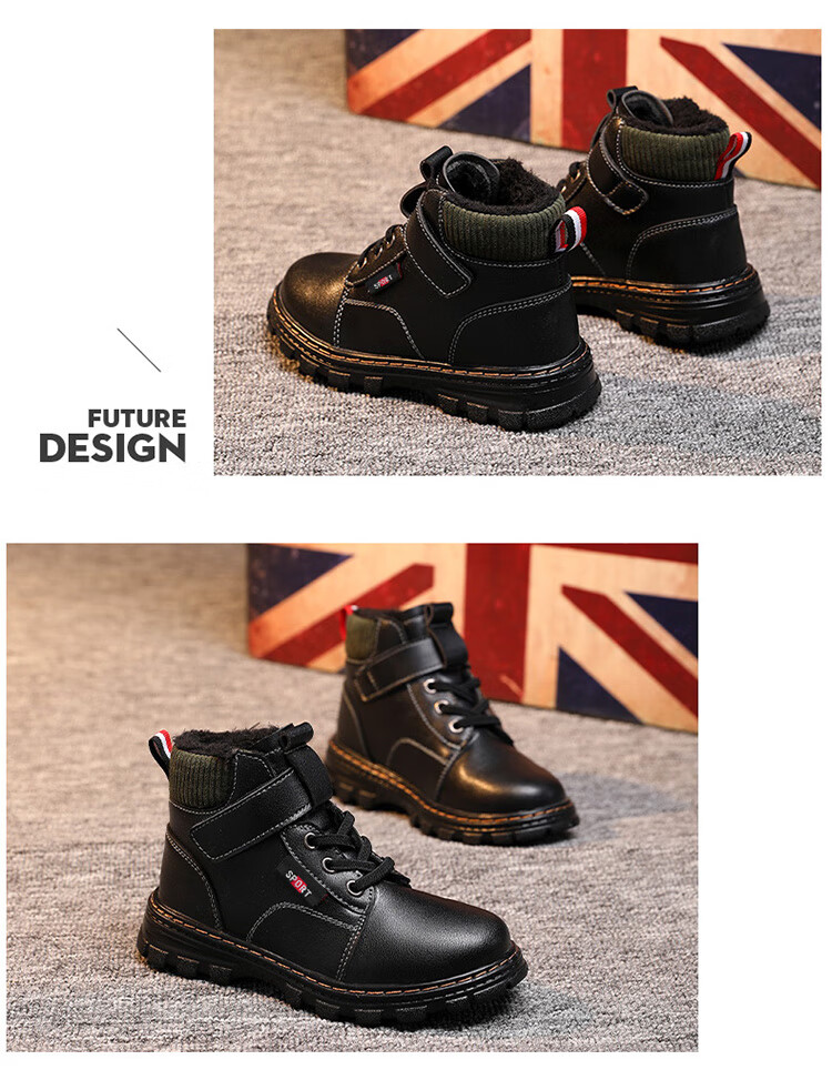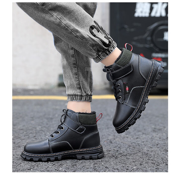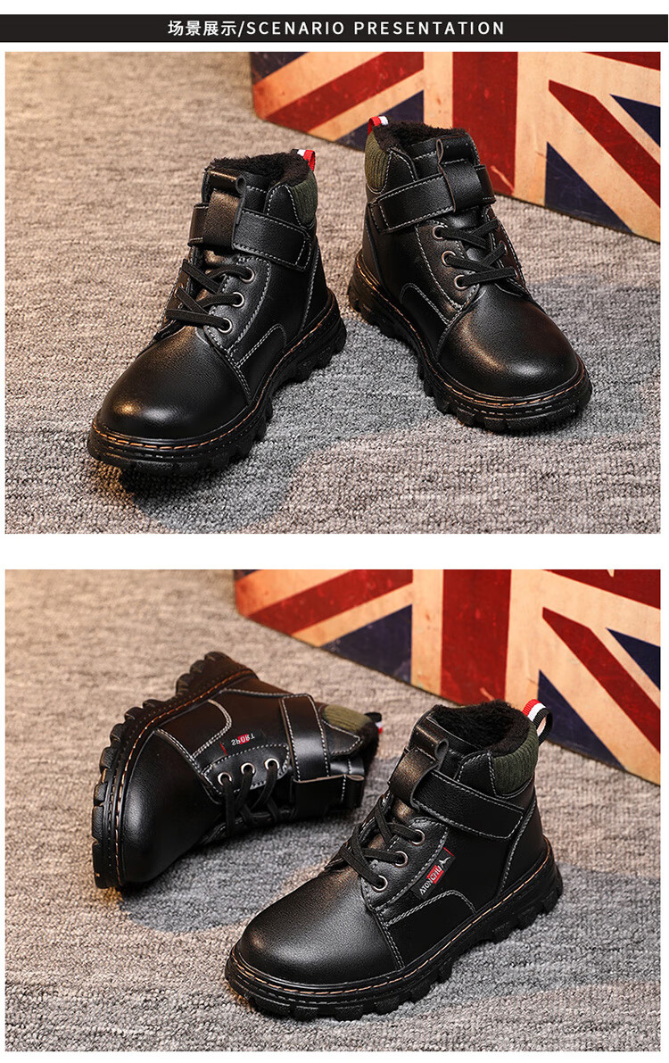 轩途诗儿童皮鞋男童马丁靴子加绒耐磨防水男童鞋男孩儿童靴子棉舒适鞋子 10083黑色加绒 38