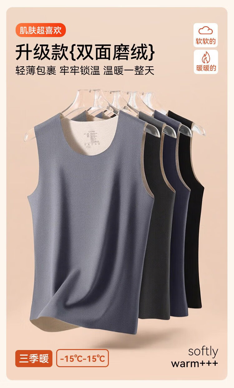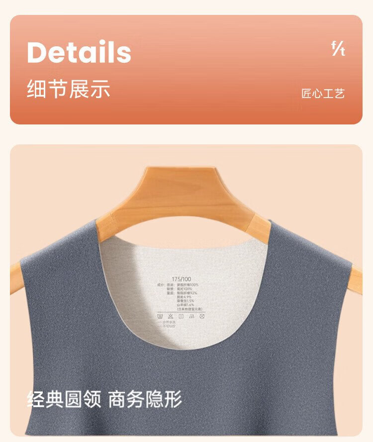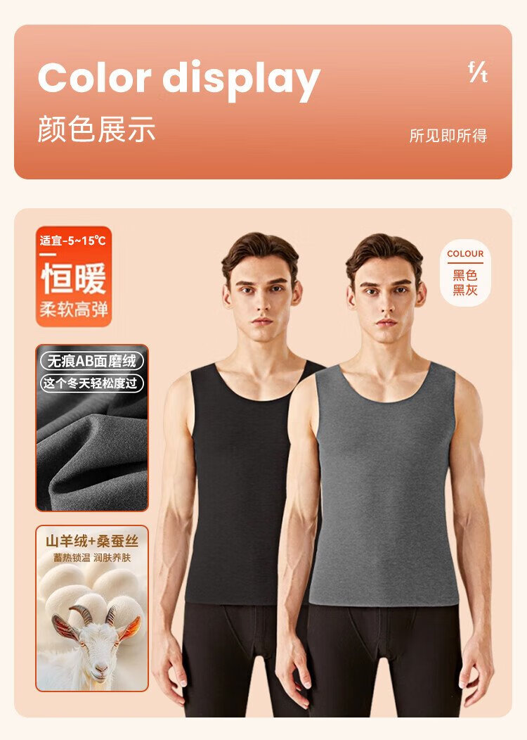 FitonTon2件装男士保暖背心含山羊绒蚕丝德绒发热无痕秋冬打底马甲坎肩