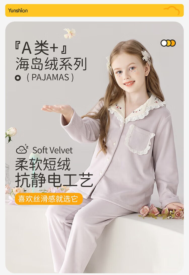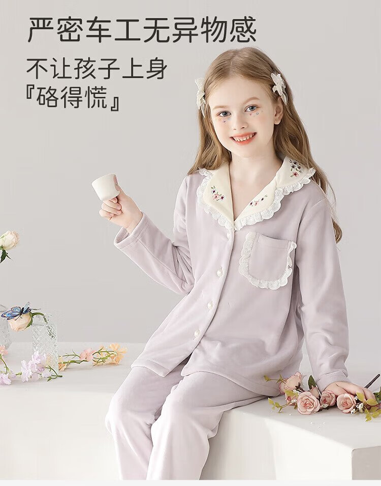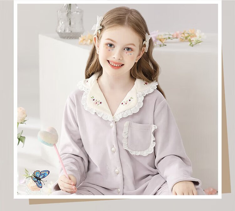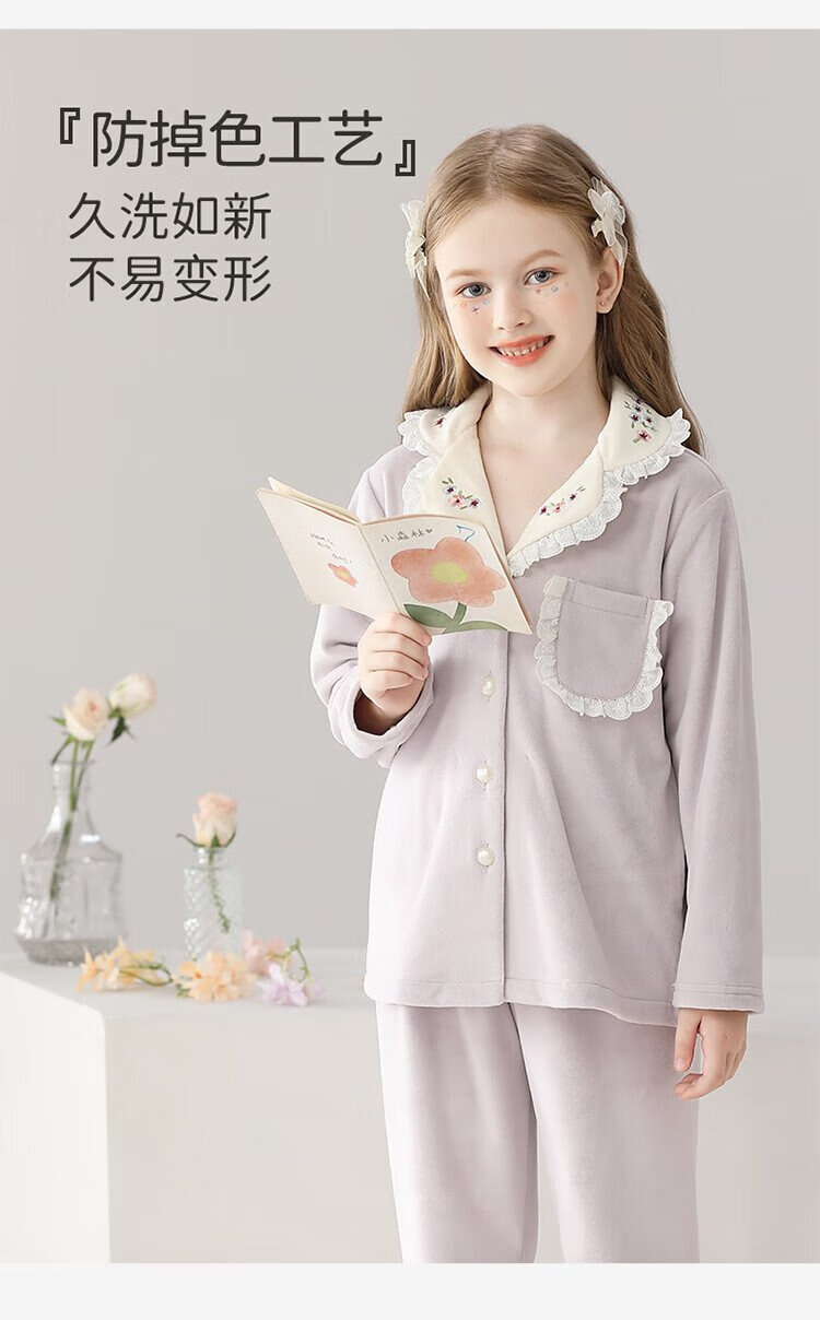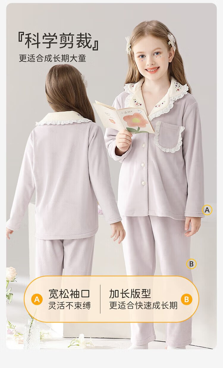 云想衣儿童睡衣女童睡衣秋冬季保暖A类防静电小碎花刺绣澳毛绒睡衣16码