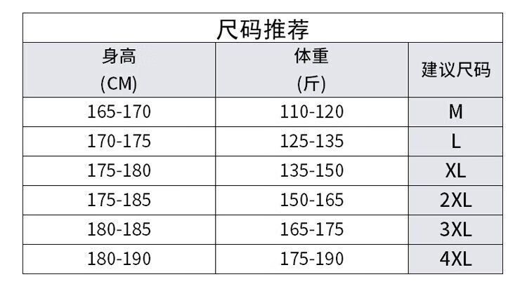 China (cm) 165 / 88-90 170 / 96-98 175 / 108-110 180 / 118-122 185 / 126-130